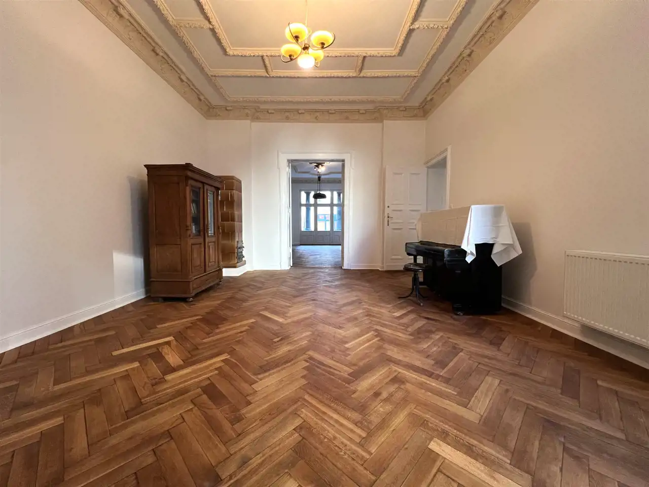 - POKÓJ FRONTOWY Z BALKONEM/SALON - opcja: 42,0 m², z balkonem od ul. Piotrkowskiej, z niego przejście przez duże podwójne drzwi do holu i do pokoju przejściowego, w pokoju ozdobny piec kaflowy, oryginalne wykończenia sufitów,