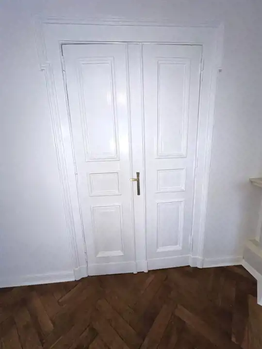 - DRZWI: zewnętrzne drzwi wejściowe antywłamaniowe, drzwi wewnętrzne w większości oryginalne, po usunięciu starej farby, pomalowane na nowo, w części pomieszczeń założone nowe drzwi w stylu nawiązującym do drzwi oryginalnych,