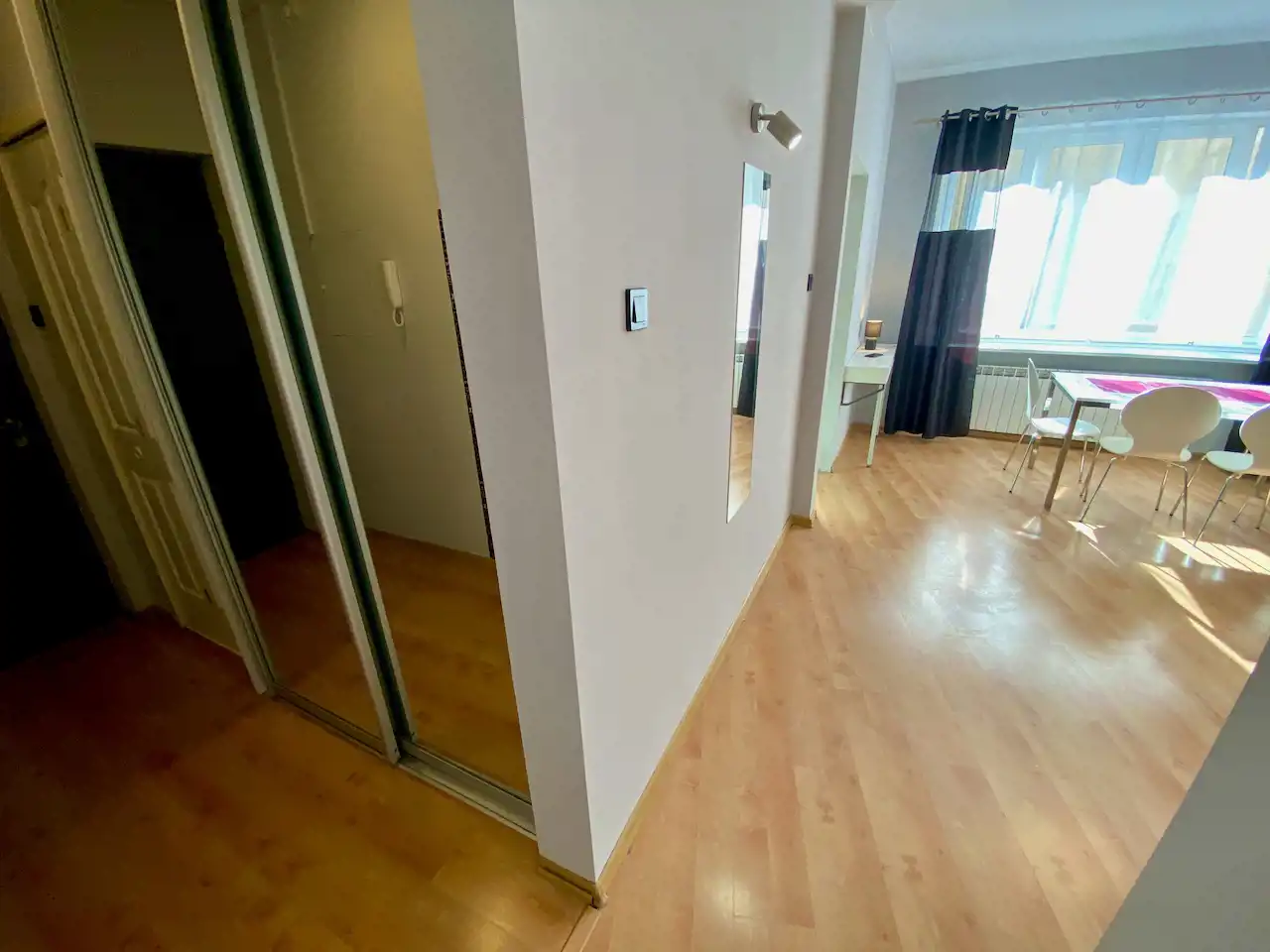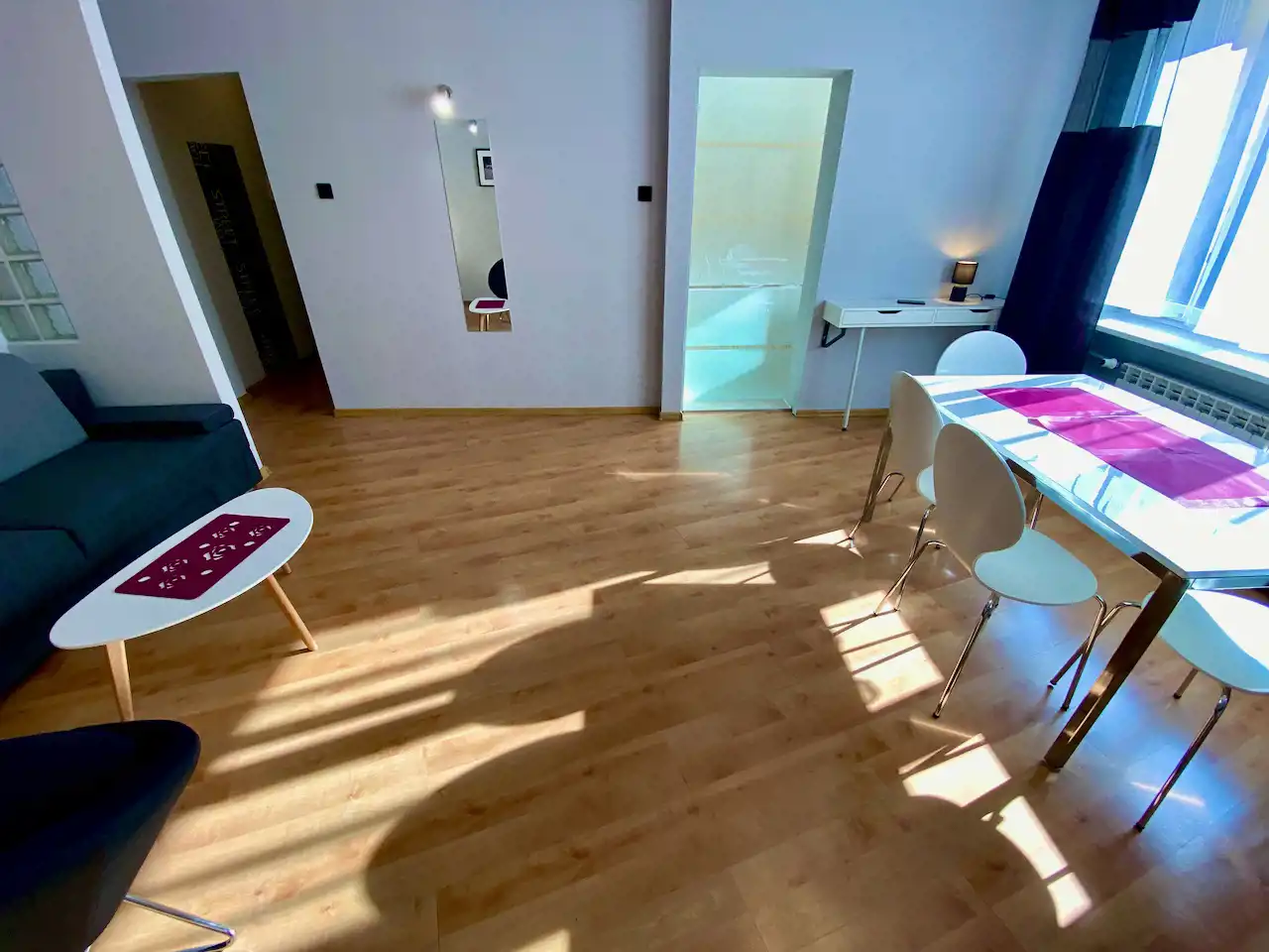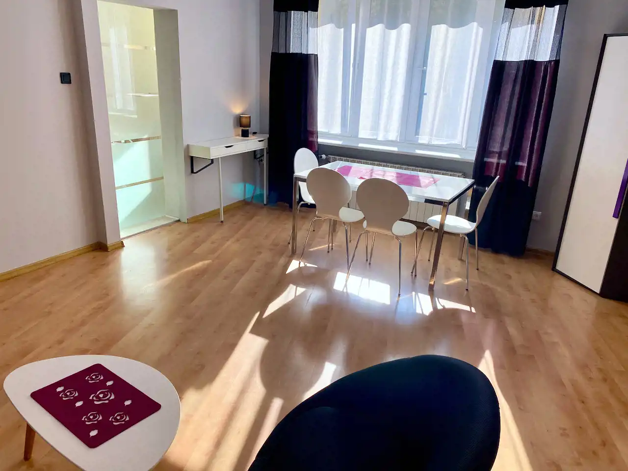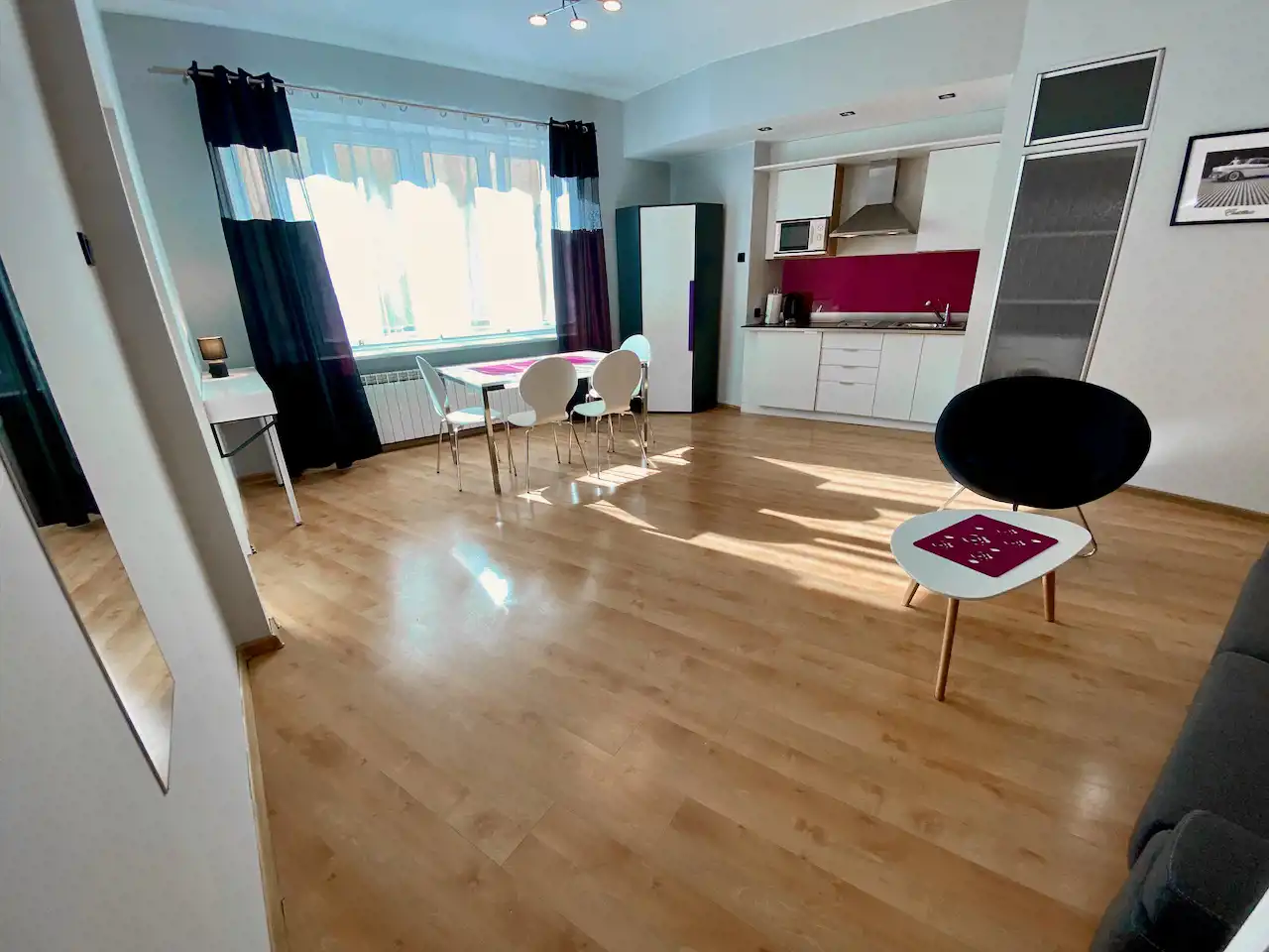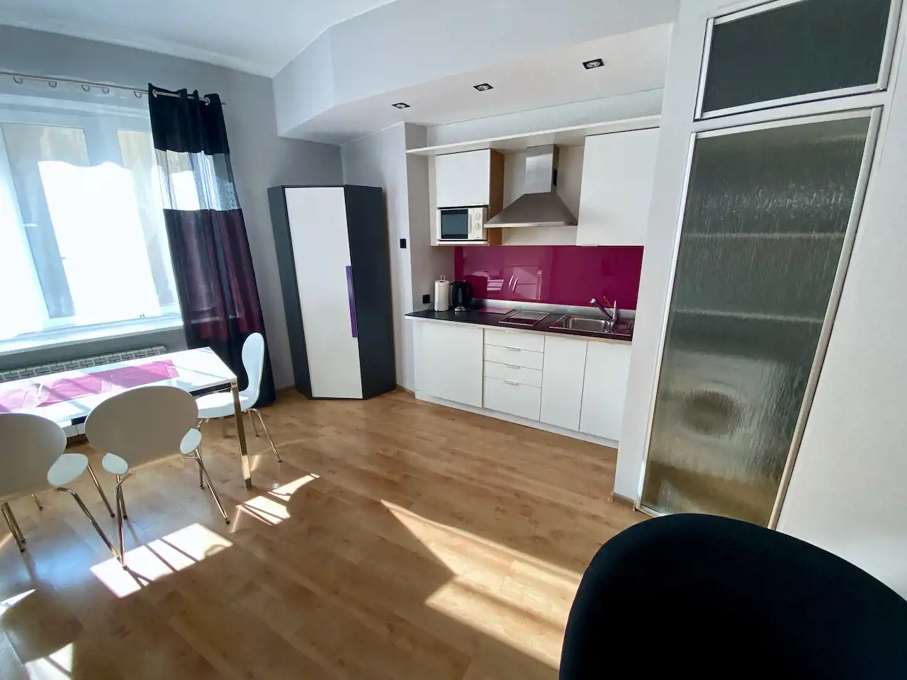 Lokal ze zmianą układu pomieszczeń - przestronny, nowocześnie urządzony pokój z aneksem kuchennym (całość ok. 28 mkw), salon łazienkowy (ok. 12 mkw), osobna toaleta. Okna nie wychodzą na ulicę, więc jest bardzo cicho i kameralnie.