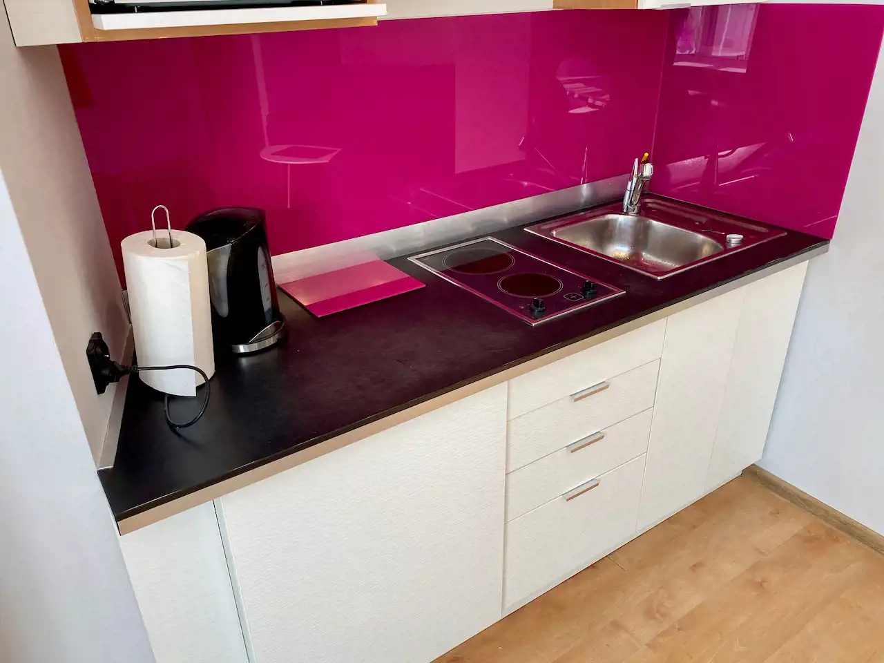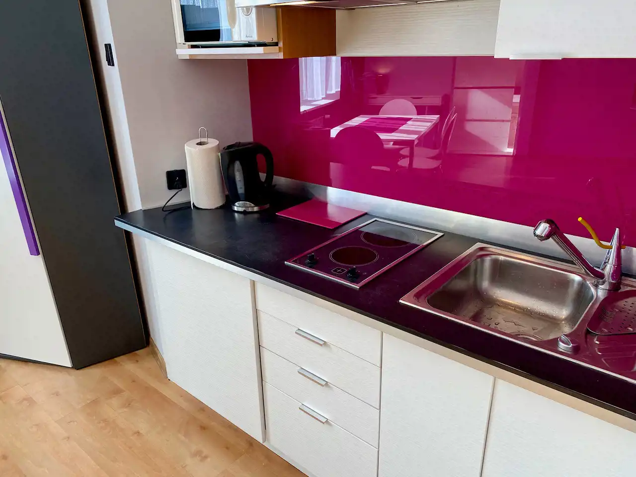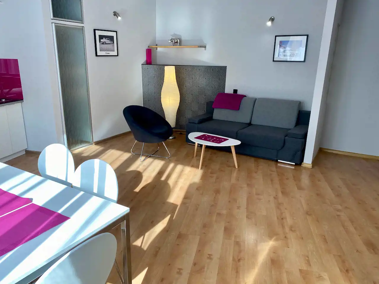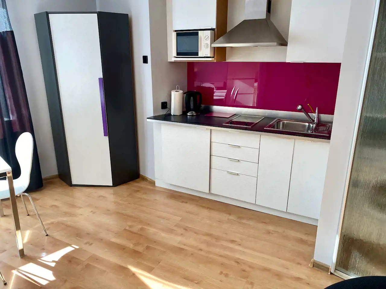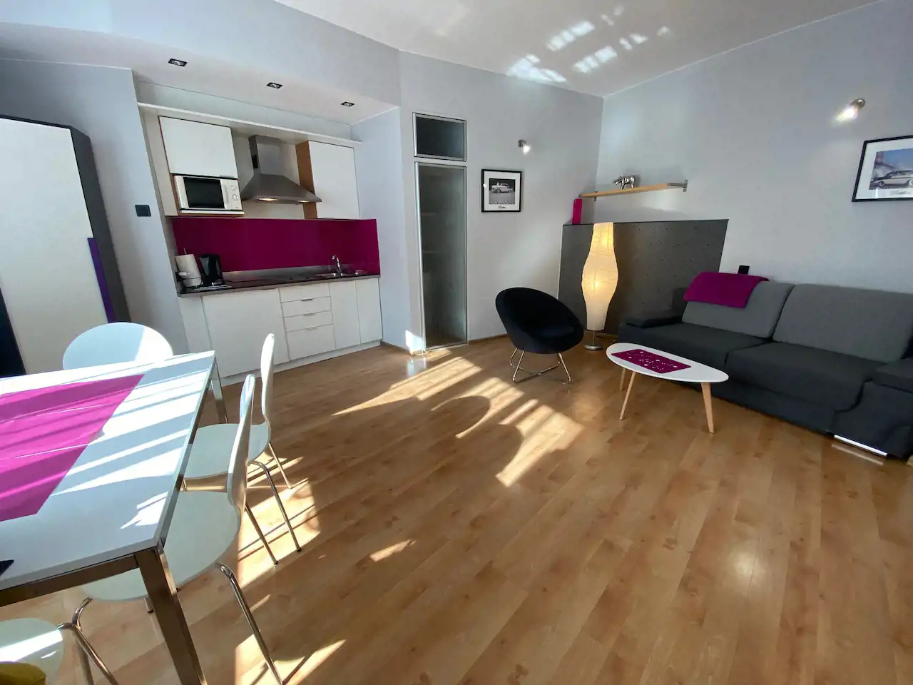 Lokal ze zmianą układu pomieszczeń - przestronny, nowocześnie urządzony pokój z aneksem kuchennym (całość ok. 28 mkw), salon łazienkowy (ok. 12 mkw), osobna toaleta. Okna nie wychodzą na ulicę, więc jest bardzo cicho i kameralnie.