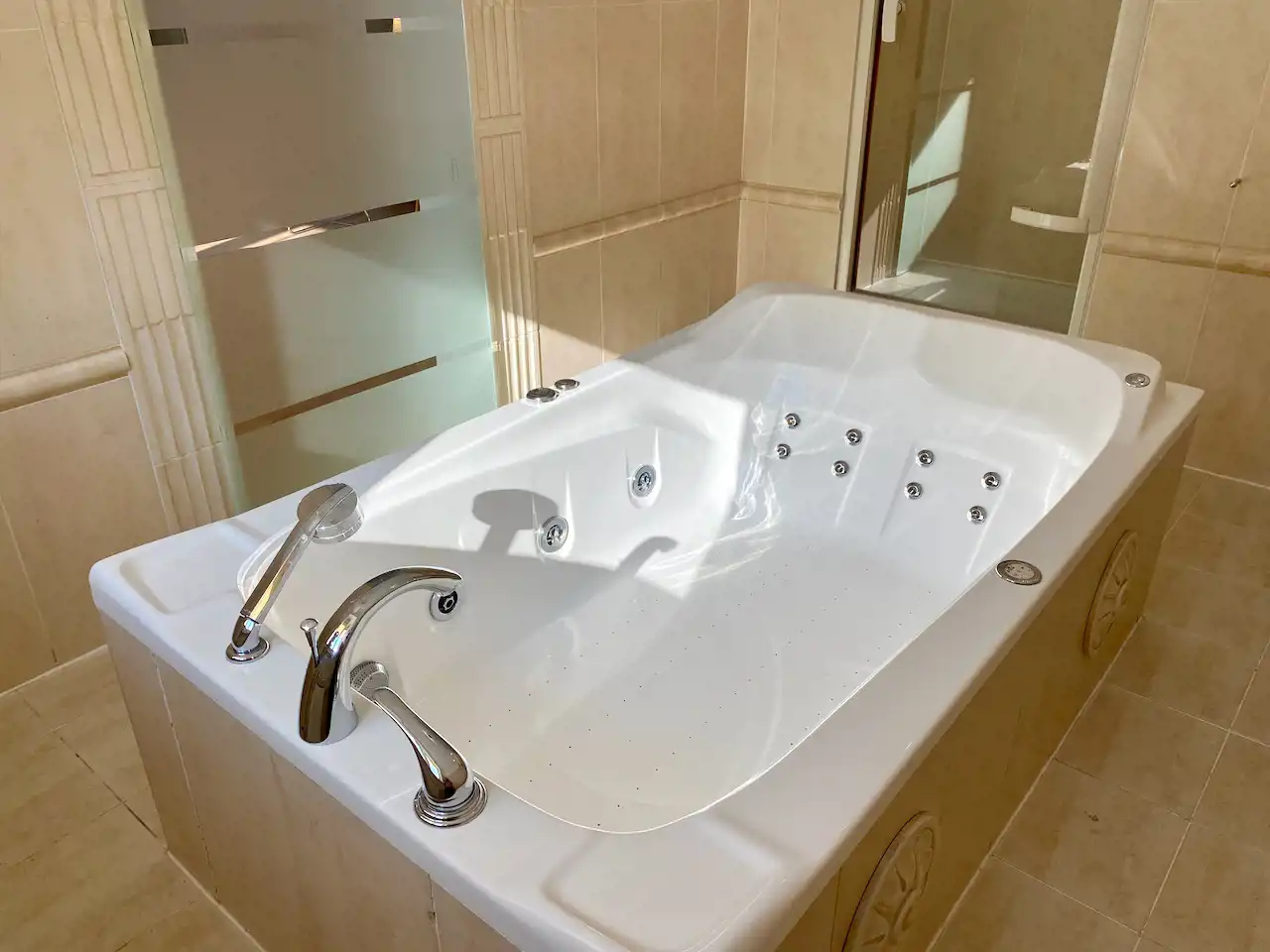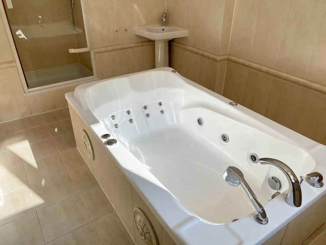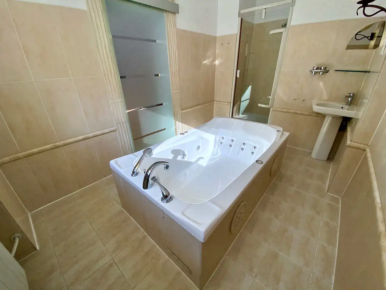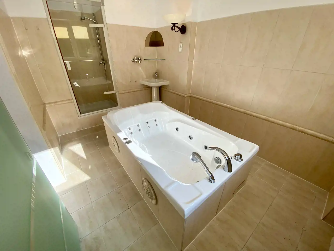 Umeblowanie pokoju - rozkładana kanapa dwu osobowa, stół z krzesłami, fotel do wypoczynku, szafa, szafka RTV, telewizor LCD, szafa wnękowa z pralką i półkami. Kompletne wyposażenie kuchni - meble w zabudowie, płyta ceramiczna 2-palnikowa, zabudowana lodówka, wyciąg, woda ciepła podgrzewana podgrzewaczem przepływowym. Łazienka z oknem z wanną z hydromasażem i osobną kabiną prysznicową i umywalką. Toaleta osobno. Woda ciepła w łazience z bojlera elektrycznego.