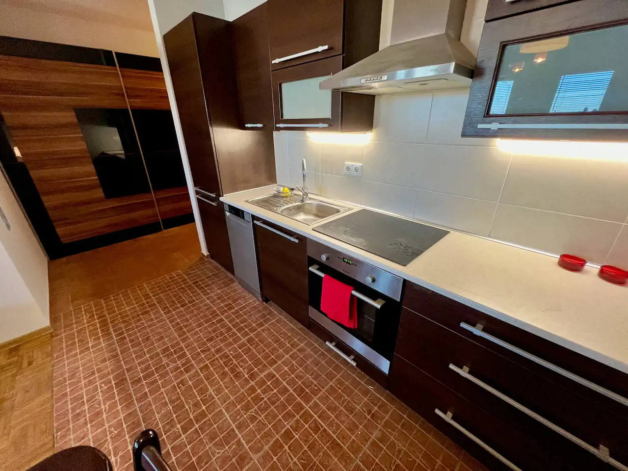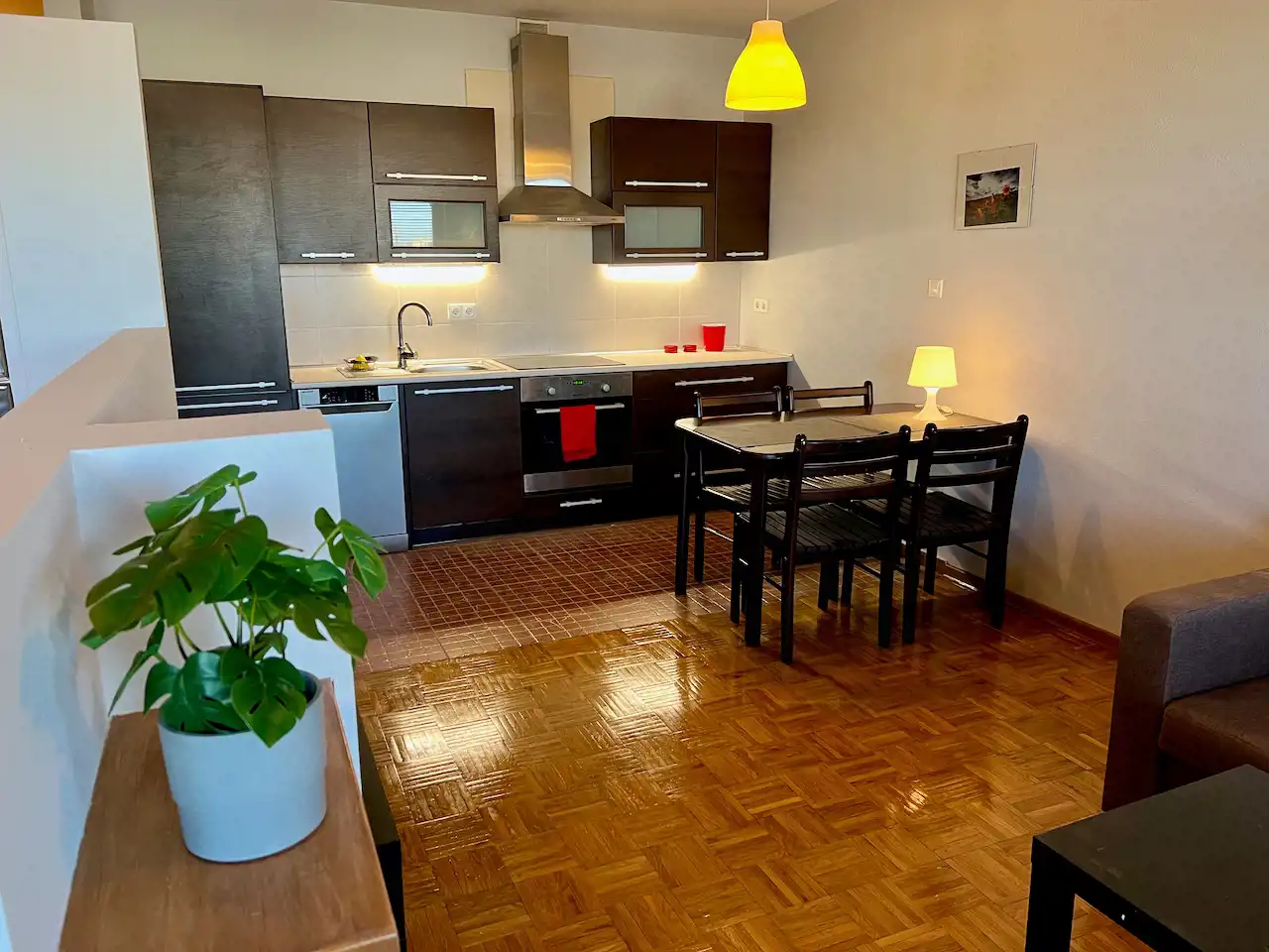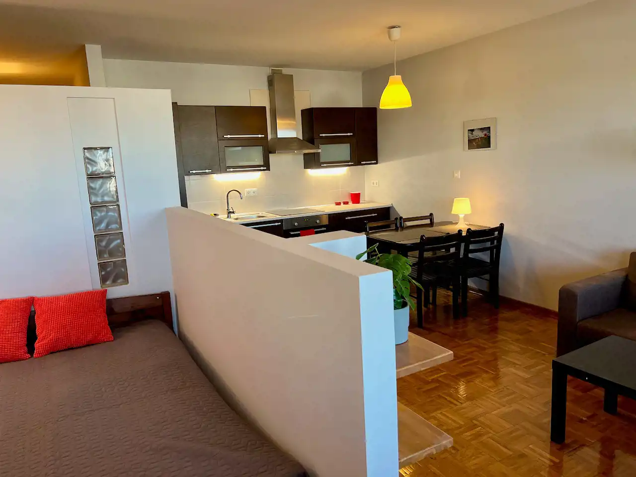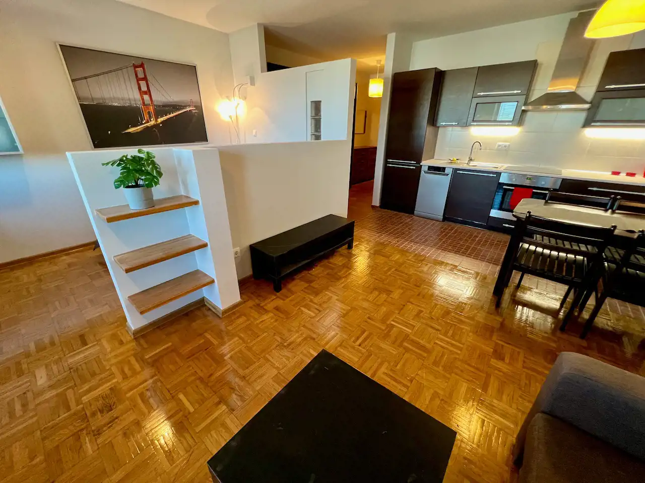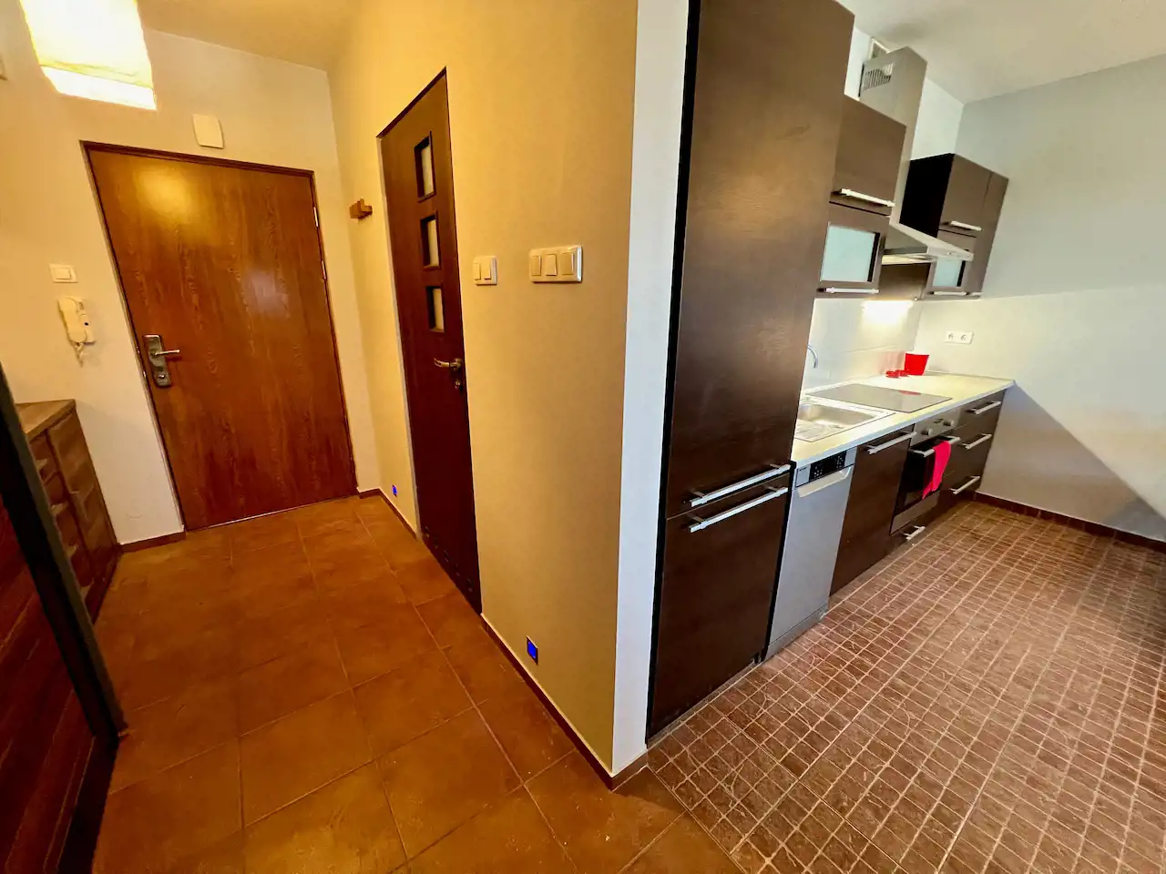Ten lokal to otwarta przestrzeń - część dzienna z aneksem kuchennym i wydzielony aneks sypialny, ponadto hol i łazienka. Mieszkanie jest całkowicie wyposażone i umeblowane. W pokoju rozkładana kanapa narożna, stół, krzesła, niska szafka RTV, niski stolik, łóżko, szafki. Okna na wschód. W kuchni meble pod wymiar, zabudowana lodówka z zamrażarką, płyta ceramiczna, piekarnik elektryczny, zmywarka, wyciąg. W przedpokoju duża szafa ubraniowa, niska komoda i lustro. W łazience wanna, umywalka, lustro, muszla WC, szafki i pralka.