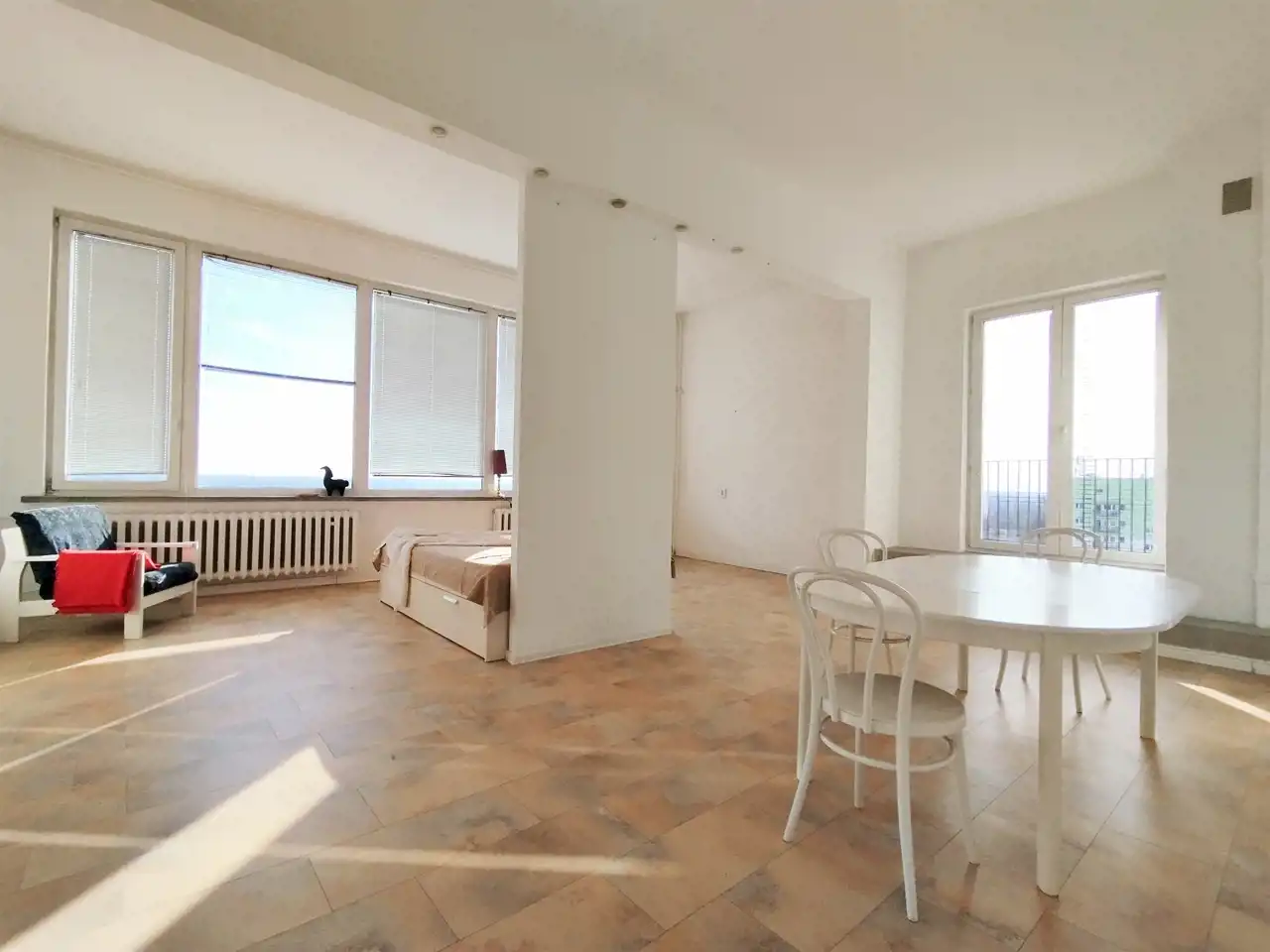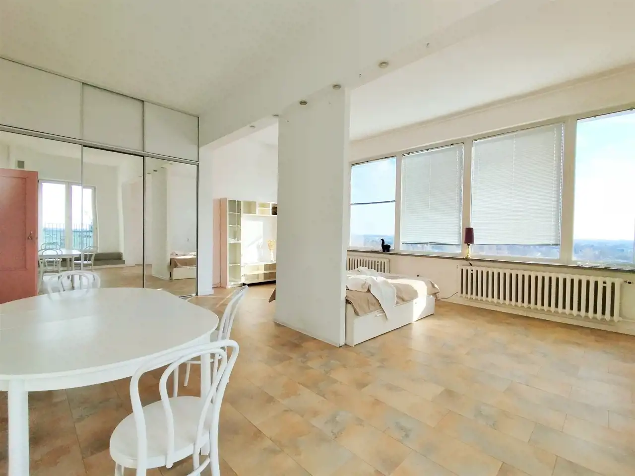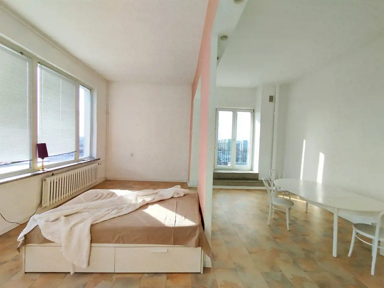 Przestronne mieszkanie o powierzchni ok. 62 mkw, o nietypowym rozkładzie położone na 11 piętrze w wieżowcu z windą nowego typu. Mieszkanie składa się z dużego pokoju (ponad 40mkw), kuchni, łazienki z wc i przedpokoju, z którego jest wejście schodami na niewielką antresolę. Mieszkanie posiada duży balkon z ciekawym widokiem. Wystawa okien - południe, wschód, zachód.