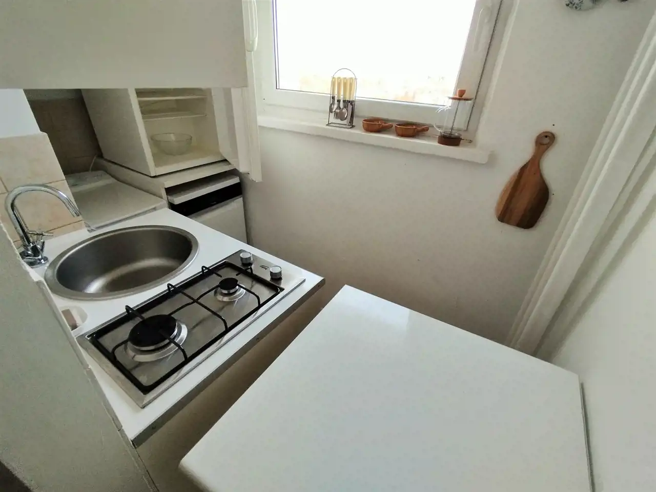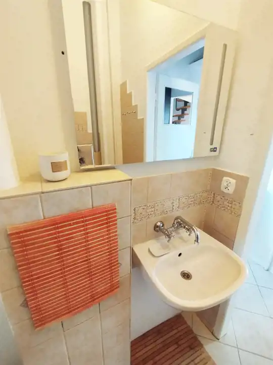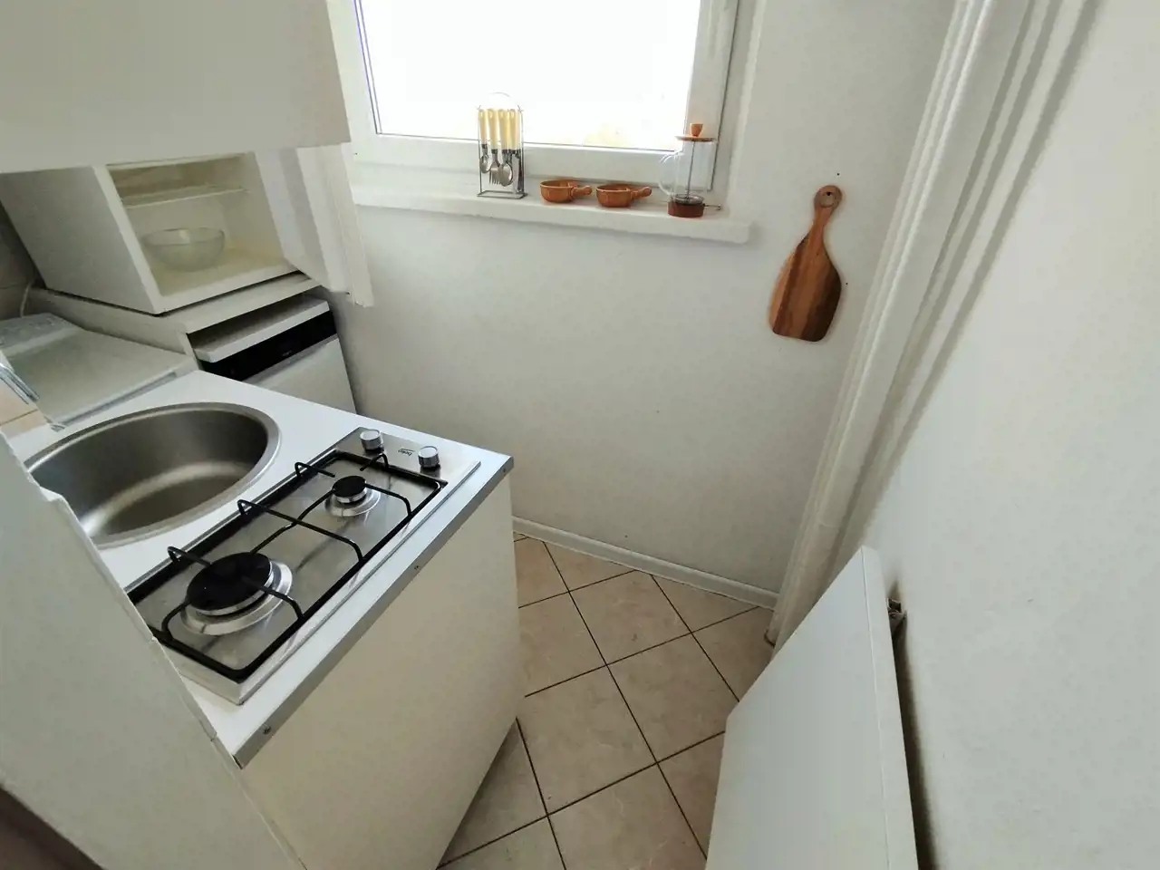 Wykończenie mieszkania: ściany malowane, dodatkowo w kuchni i łazience częściowo glazura; w pokoju na podłodze płytki pcv imitujące kamień, w pozostałych pomieszczeniach terakota. Okna PCV, z żaluzjami. W łazience wanna.