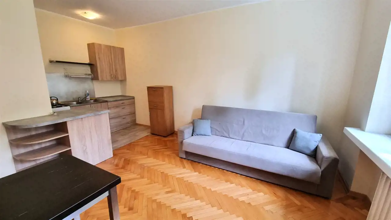 - I POKÓJ: z aneksem kuchennym ok. 18 m kw, podłoga parkiet po cyklinowaniu, ściany gładzie gipsowe, malowane, kanapa, regał ,