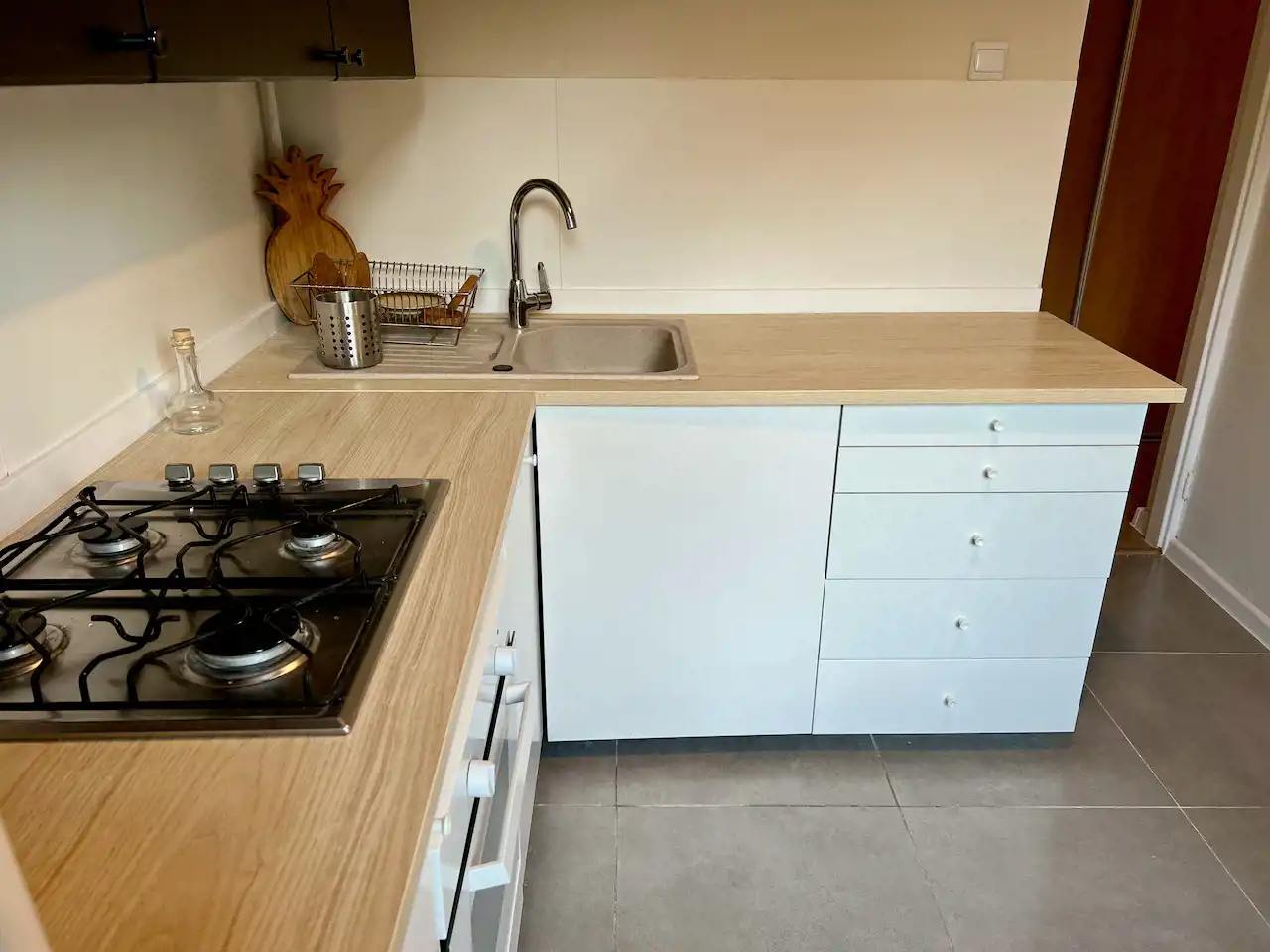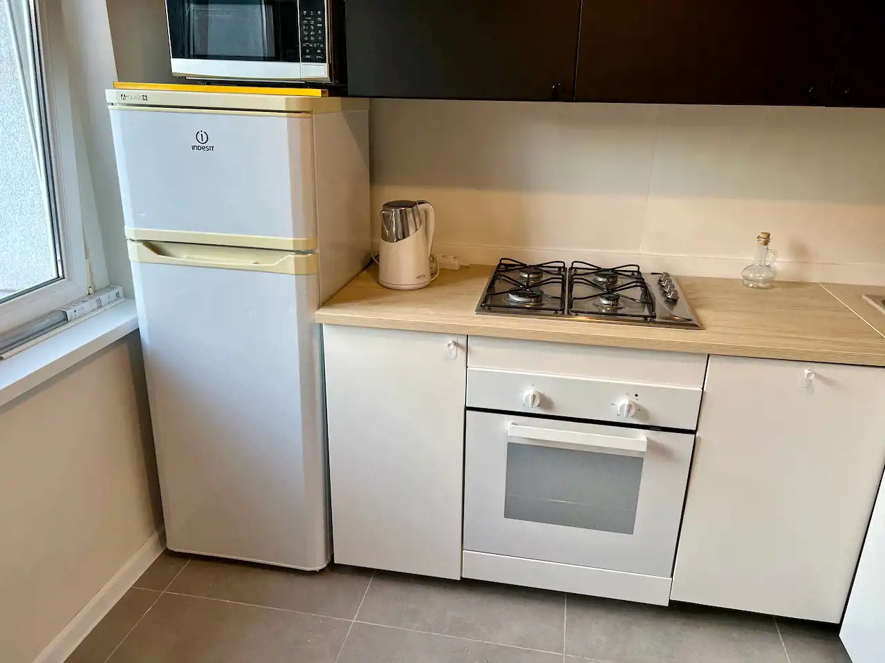 W większym pokoju dwie kanapy klubowe, stół i regał. W mniejszym pokoju rozkładana kanapa i regał. W kuchni nowe meble pod wymiar, płyta gazowa z piekarnikiem elektrycznym, lodówko-zamrażarka i zabudowana zmywarka. W łazience kabina prysznicowa, pralka, umywalka na szafce. W przedpokoju szafa pod wymiar. Z dużego pokoju wyjście na balkon.