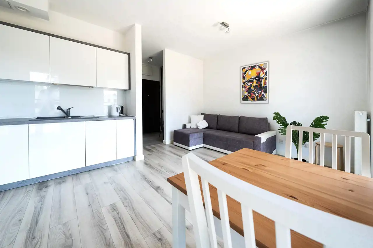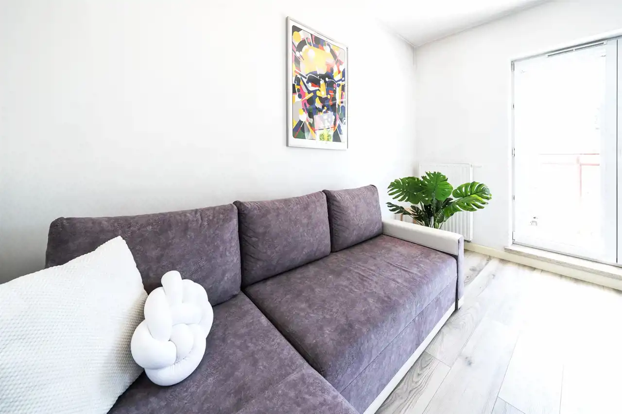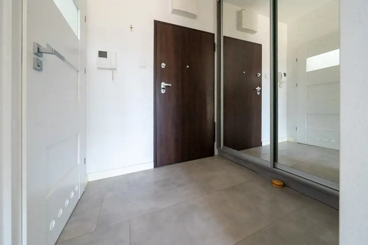 Nowe mieszkanie na pierwszym piętrze w bloku z windą. Powierzchnia 27 m2 obejmuje przestronny, jasny, dobrze doświetlony pokój z wyjściem na duży balkon oraz z urządzonym nowoczesnym aneksem kuchennym, który jest wyposażony między innymi w lodówkę, płytę indukcyjną i zmywarkę. Łazienka z kabiną prysznicową, pralką , umywalką i wc. Dodatkowe wyposażenie: (meble - kanapa, lodówka, pralka, zmywarka na gwarancji). Do mieszkania przynależy komórka lokatorska oraz dodatkowo płatne miejsce postojowe w garażu podziemnym. W korytarzu drzwi antywłamaniowe, znajduje się tam również videofon. Całodobowa ochrona i monitoring osiedla.