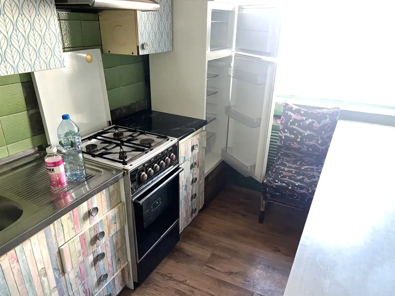 - KUCHNIA: 5,7 m², zestaw szafek kuchennych starszego typu, lodówka z zamrażarką, kuchnia gazowa,