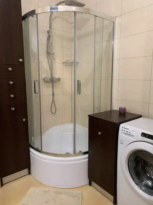 Łazienka z Wc : glazura, terakota, natrysk, pralka.