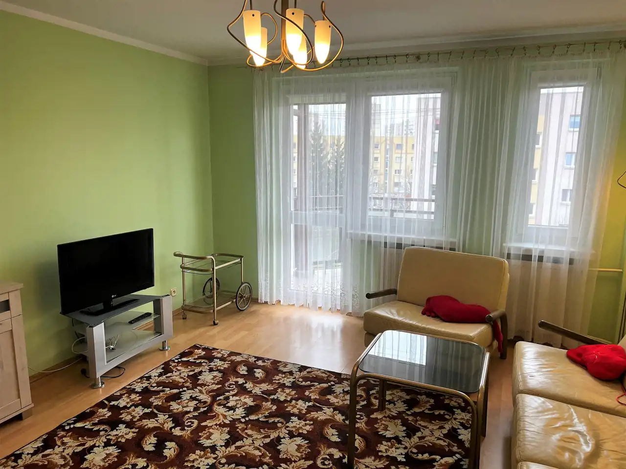 - SALON: witryna, komoda, kanapa (nierozkładana), fotel, pufa - skóra , telewizor i stolik pod telewizor, ława szklana, stół + 2 krzesła, dywan, lampa stojąca, lampa górna wisząca,