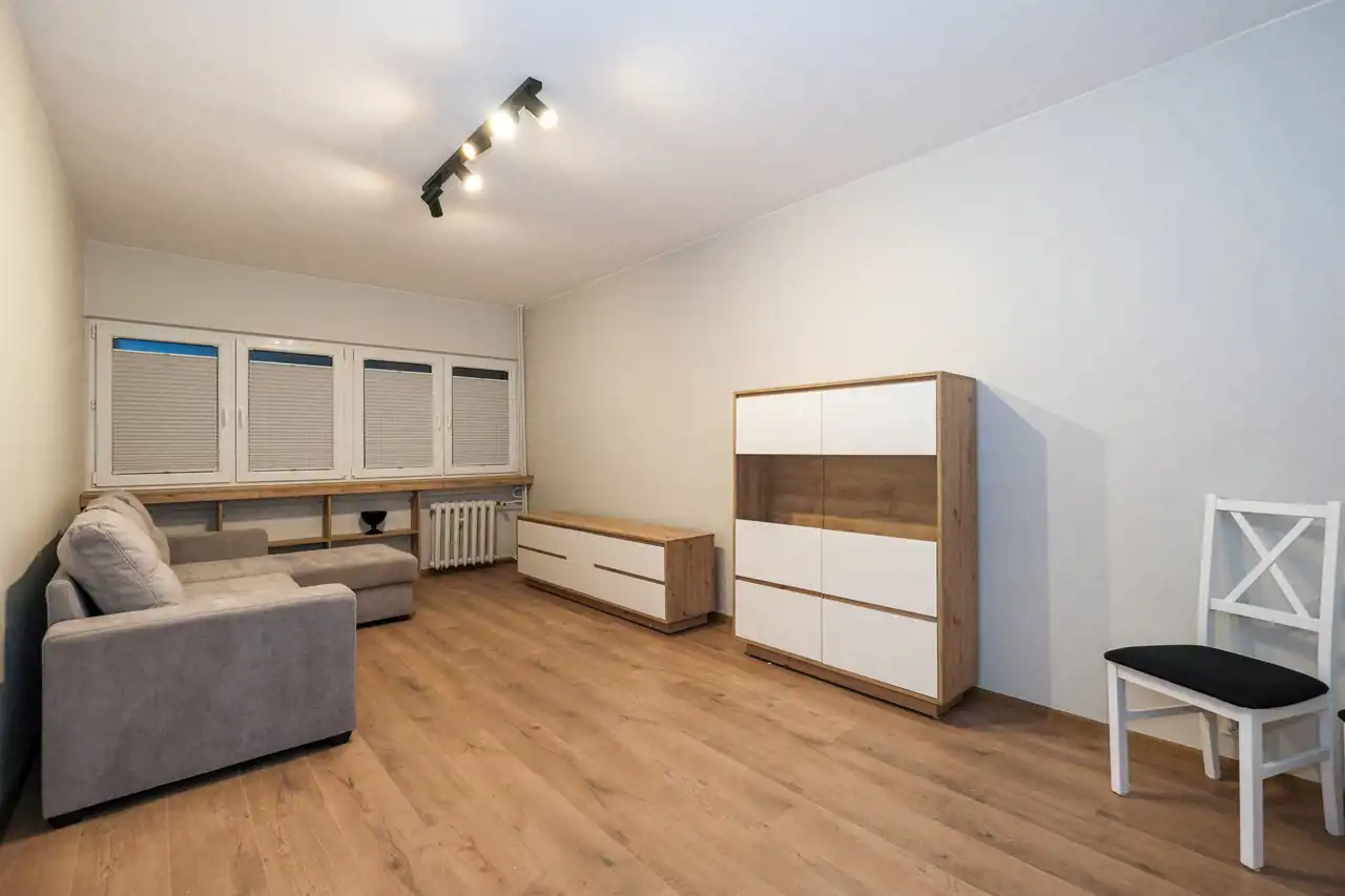 Mieszkanie częściowo umeblowane i wyposażone. W części wypoczynkowej (duży pokój) nowa, rozkładana kanapa naroża, stół z krzesłami, komody. W kuchni meble plus lodówka, zmywarka, kuchenka gazowa z piekarnikiem.