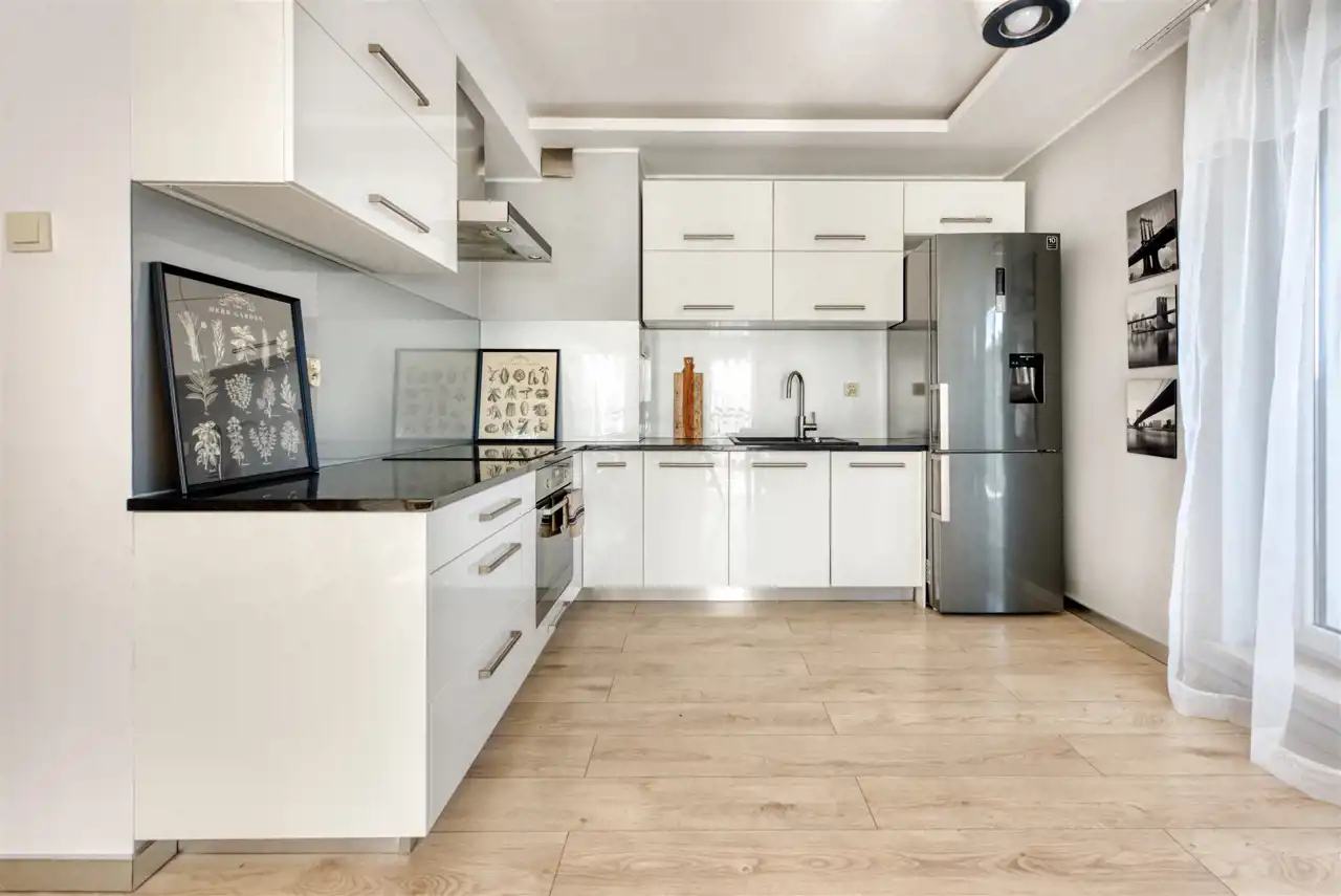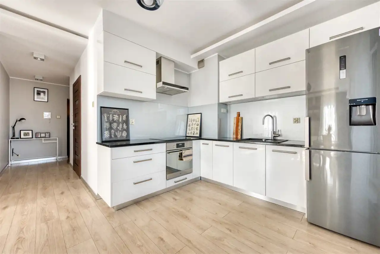 - otwartą kuchnię wyposażoną w płytę induckyjną, okap, piekarnik, lodówkę z zamrażarką, zmywarkę oraz drobne wyposażenie kuchenne;
