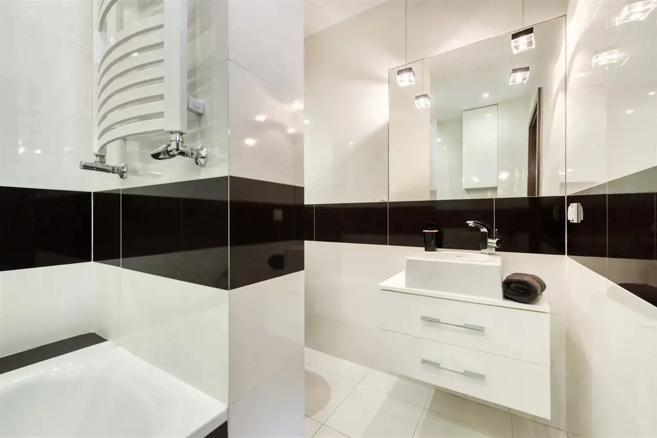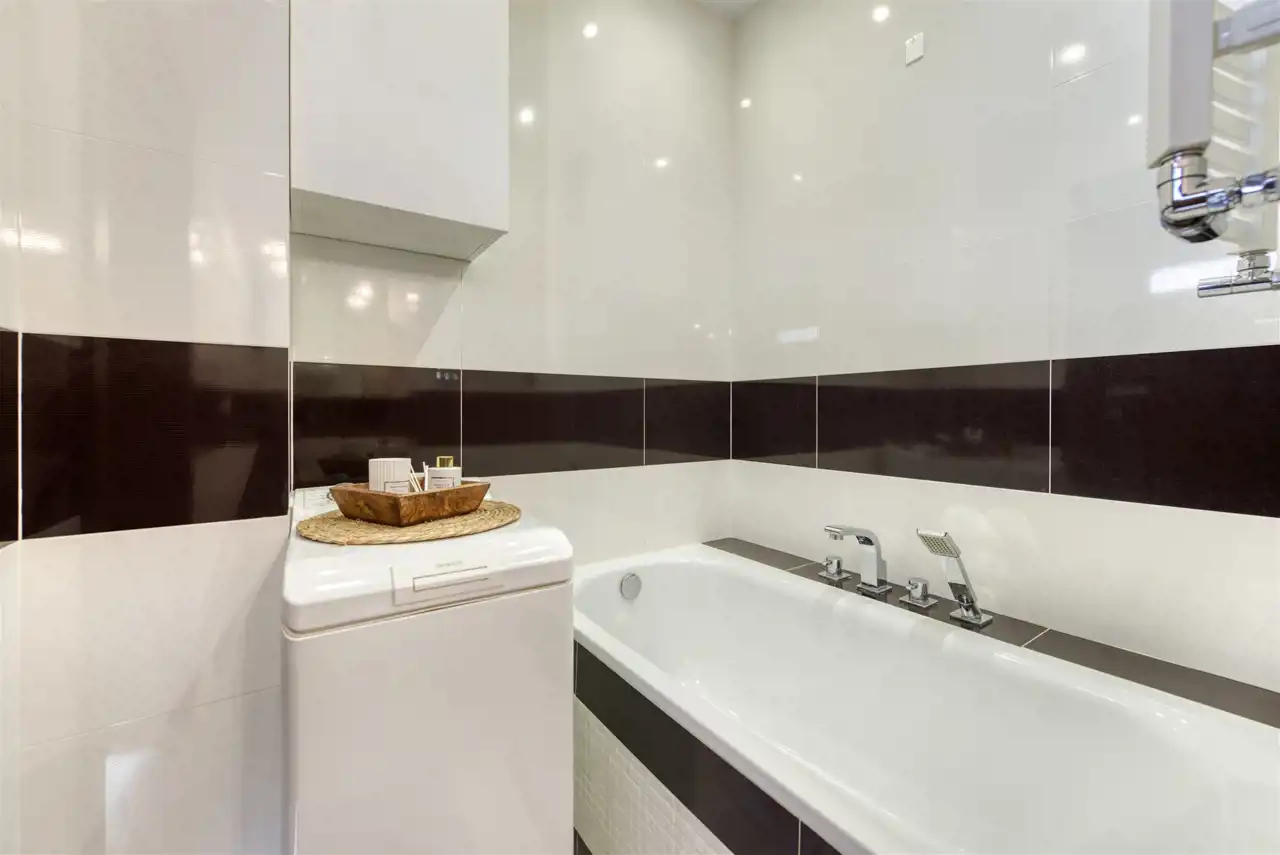 - nowoczesną łazienkę wyposażoną w wannę oraz pralkę;