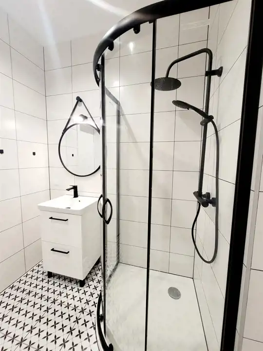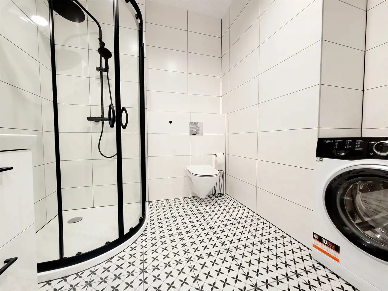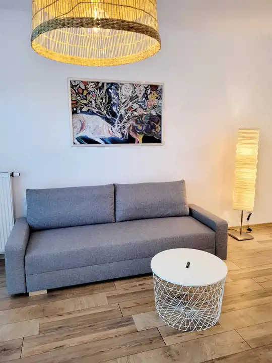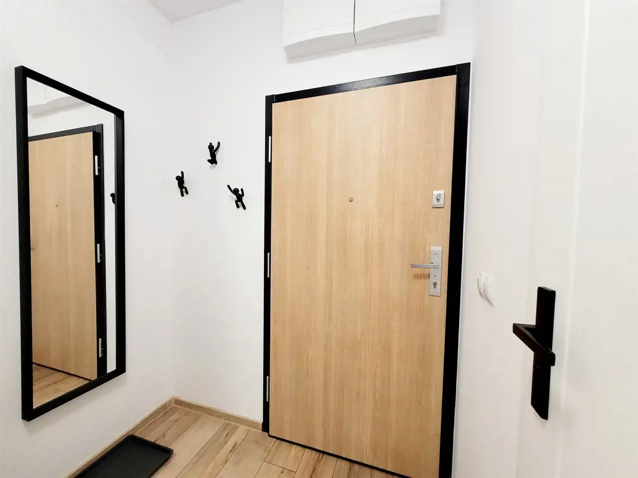 Mieszkanie jest w pełni wyposażone i umeblowane w bardzo dobrym standardzie. Urządzono przestrzeń kuchenną (ze zmywarką, kuchenką i lodówką) oraz salon ze stołem, kanapą rozkładaną i meblami; w korytarzu pojemna szafa oraz duża łazienka z wc, prysznicem i pralką.