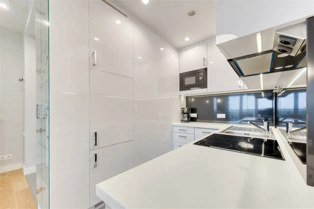 - aneks kuchenny wyposażony w płytę indukcyjną, piekarnik, lodówkę z zamrażarką, zmywarkę, mikrofalówkę oraz drobne wyposażenie;