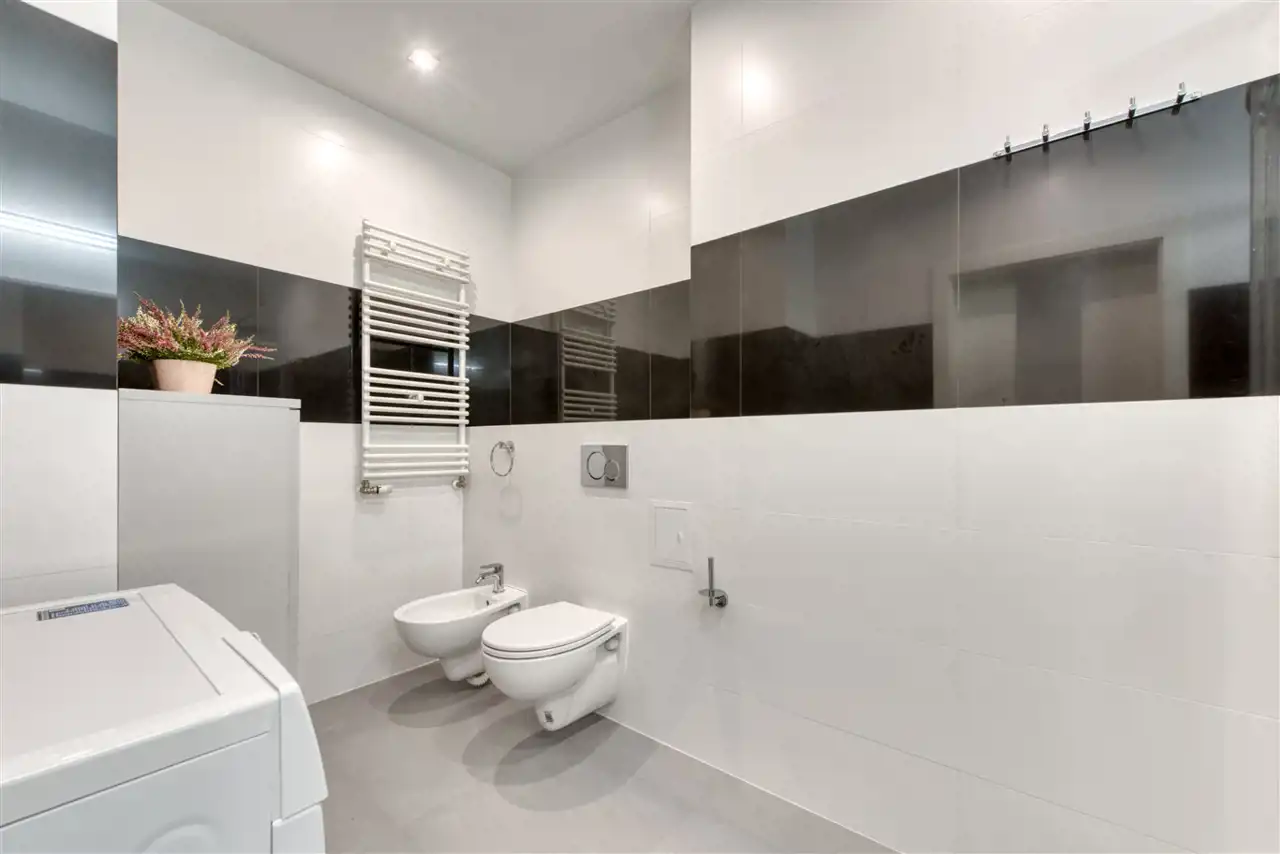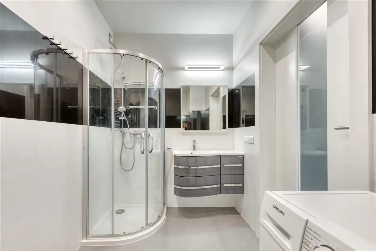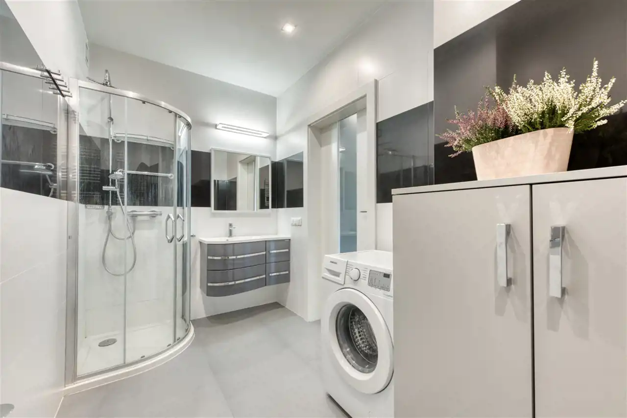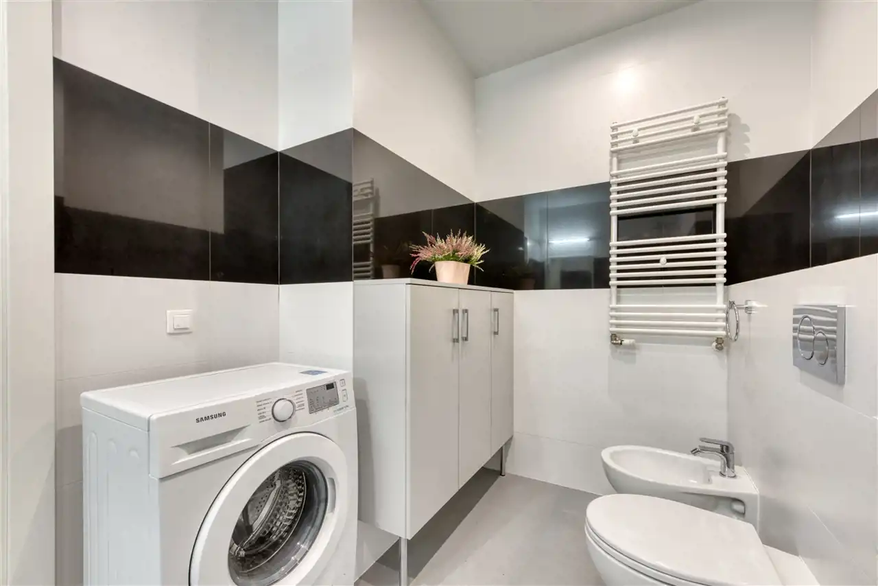 - nowoczesną łazienkę z WC wyposażoną w prysznic oraz pralkę;
