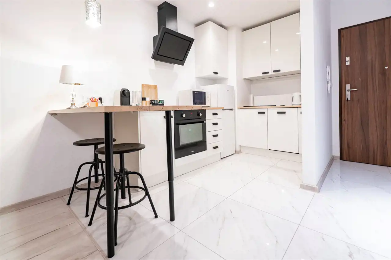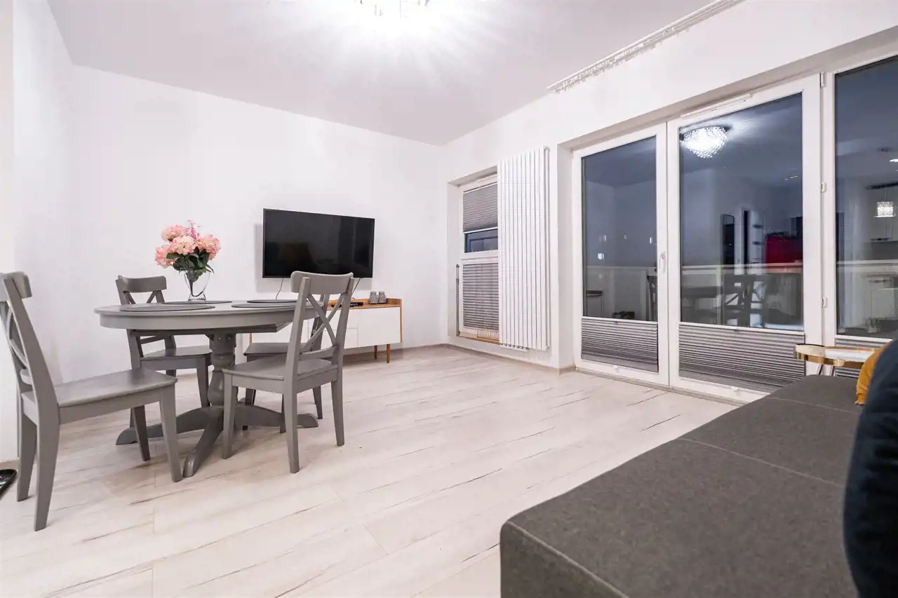 W pełni wyposażone - w salonie znajdziemy wygodną rozkładaną kanapę, szafkę RTV, komfortowy stół z krzesłami oraz pakowną szafę (niewidoczna na zdjęciach). Kuchnia wyposażona we wszystkie niezbędne sprzęty i akcesoria - lodówka, zamrażarka, zmywarka, piekarnik, płyta indukcyjna, pełne wyposażanie kuchni - naczynia, sztućce, kubki itp. W łazience prysznic, WC, umywalka, pralka oraz miejsce do przechowywania.