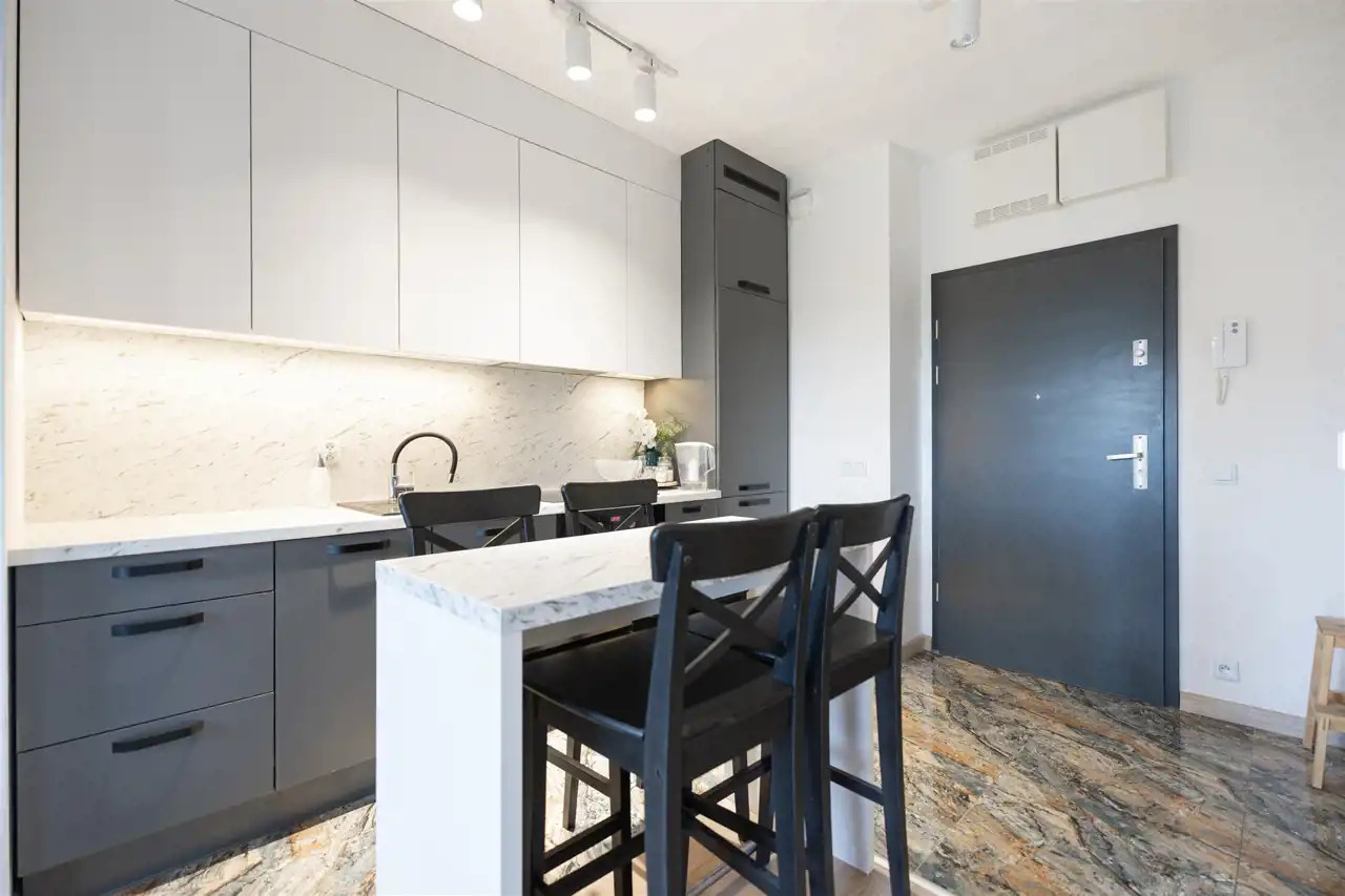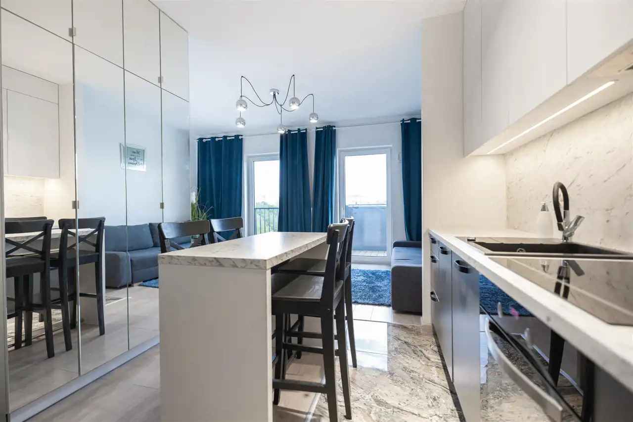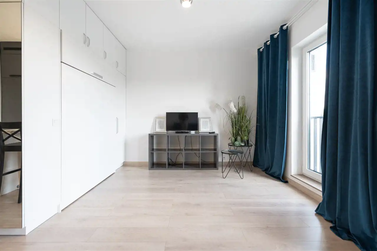 Kompletnie umeblowane. Pokój posiada rozkładaną, wygodną kanapę, ukryte łóżko z materacem, szafkę RTV, telewizor, szafę w zabudowie. Aneks kuchenny w pełni wyposażony we wszystkie niezbędne sprzęty m.in. lodówkę, zmywarkę, piekarnik, płytę indukcyjną, czajnik. dodatkowo kuchnia posiada wyspę z krzesłami. W łazience znajduje się prysznic, toaleta, umywalka z szafką oraz pralka.