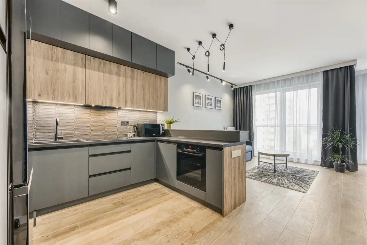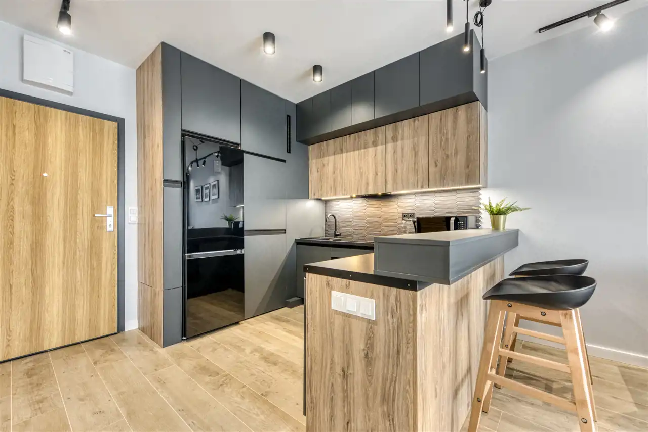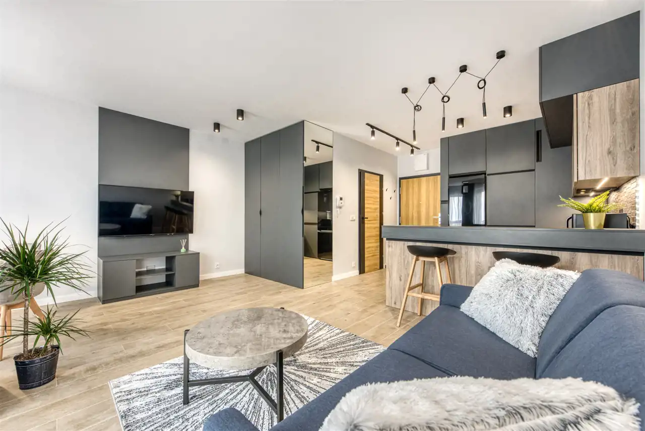 - funkcjonalny aneks kuchenny wyposażony w płytę indukcyjną, okap, piekarnik, lodówkę z zamrażarką i zmywarkę;