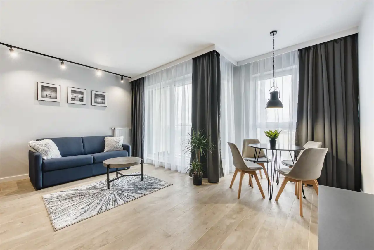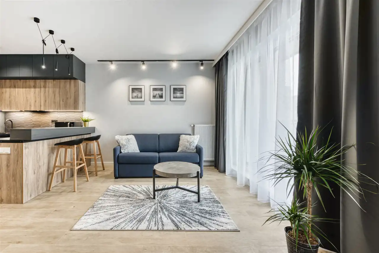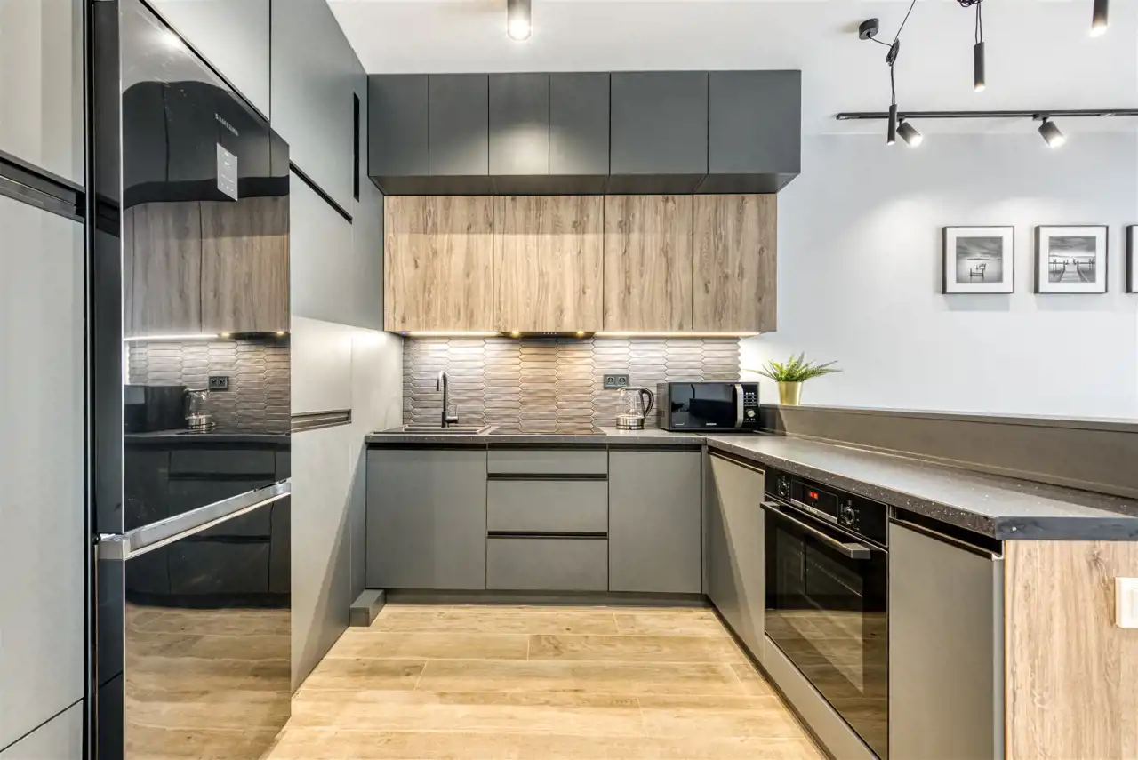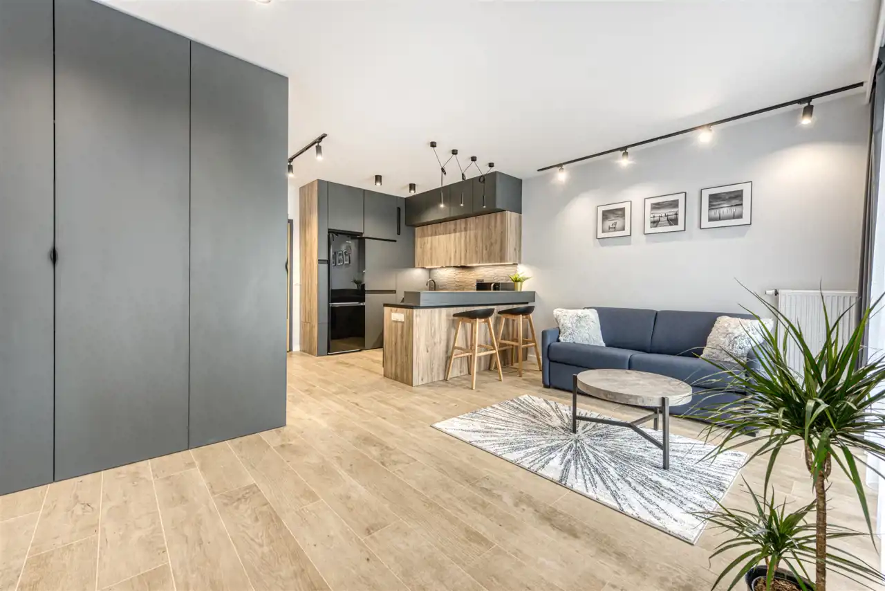 - funkcjonalny aneks kuchenny wyposażony w płytę indukcyjną, okap, piekarnik, lodówkę z zamrażarką i zmywarkę;