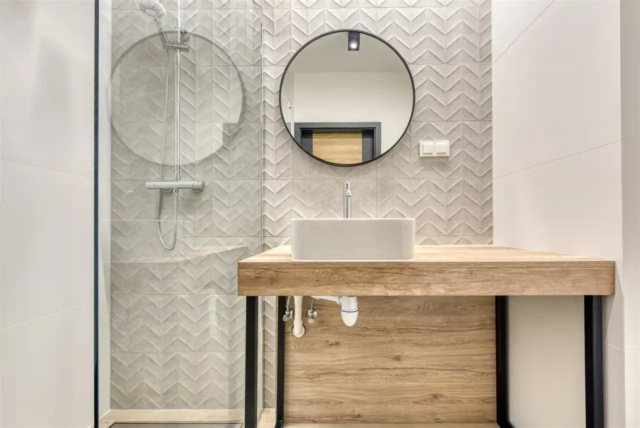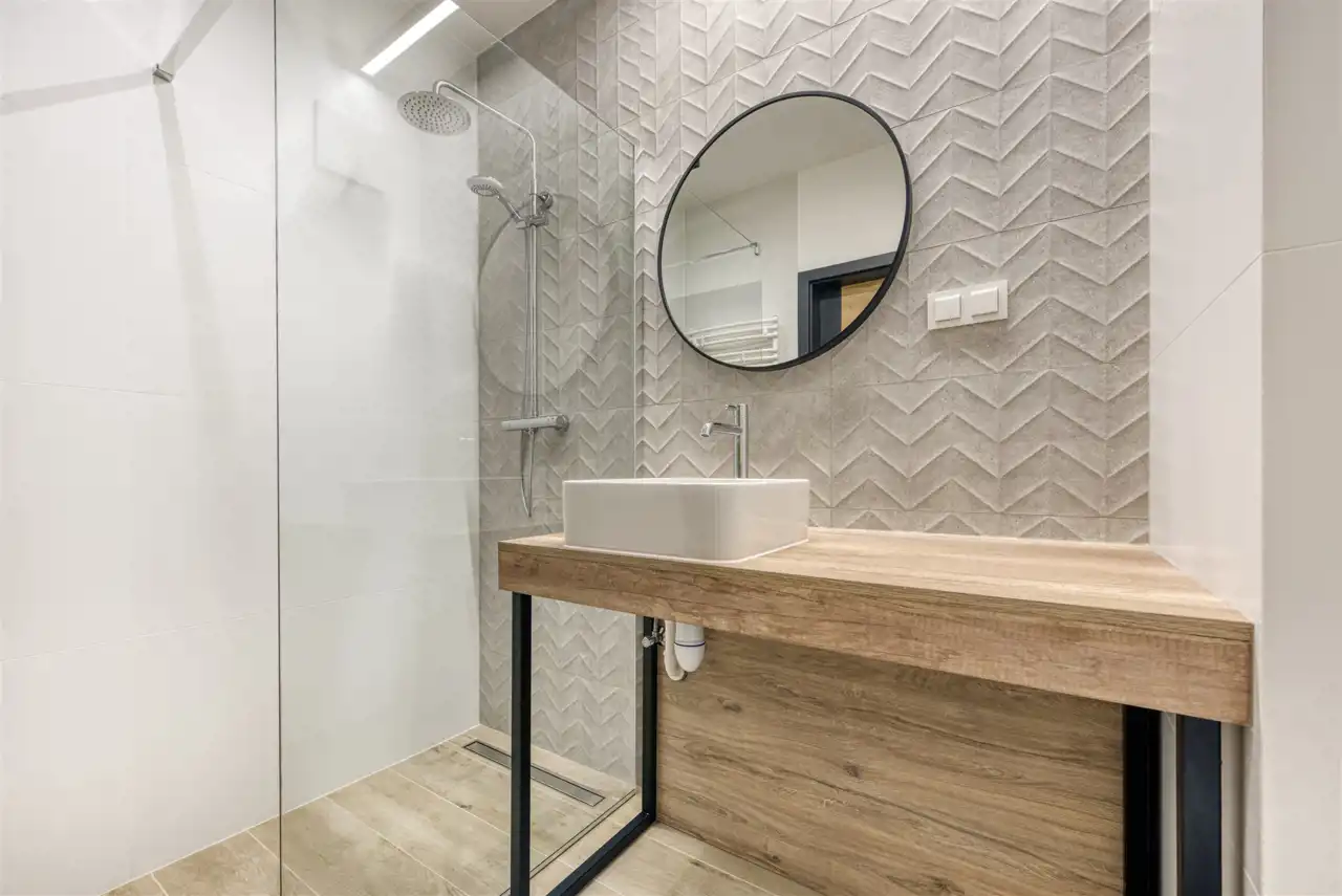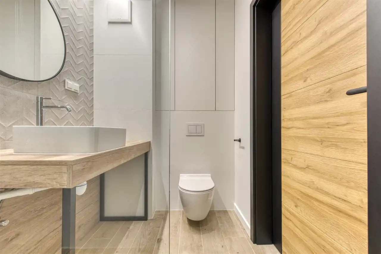 - nowoczesną łazienkę wyposażoną w natrysk, pralkę, suszarkę, WC;