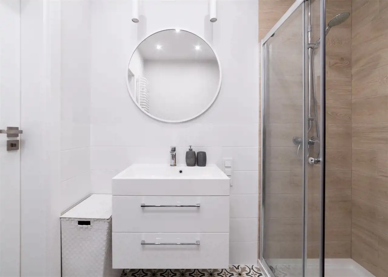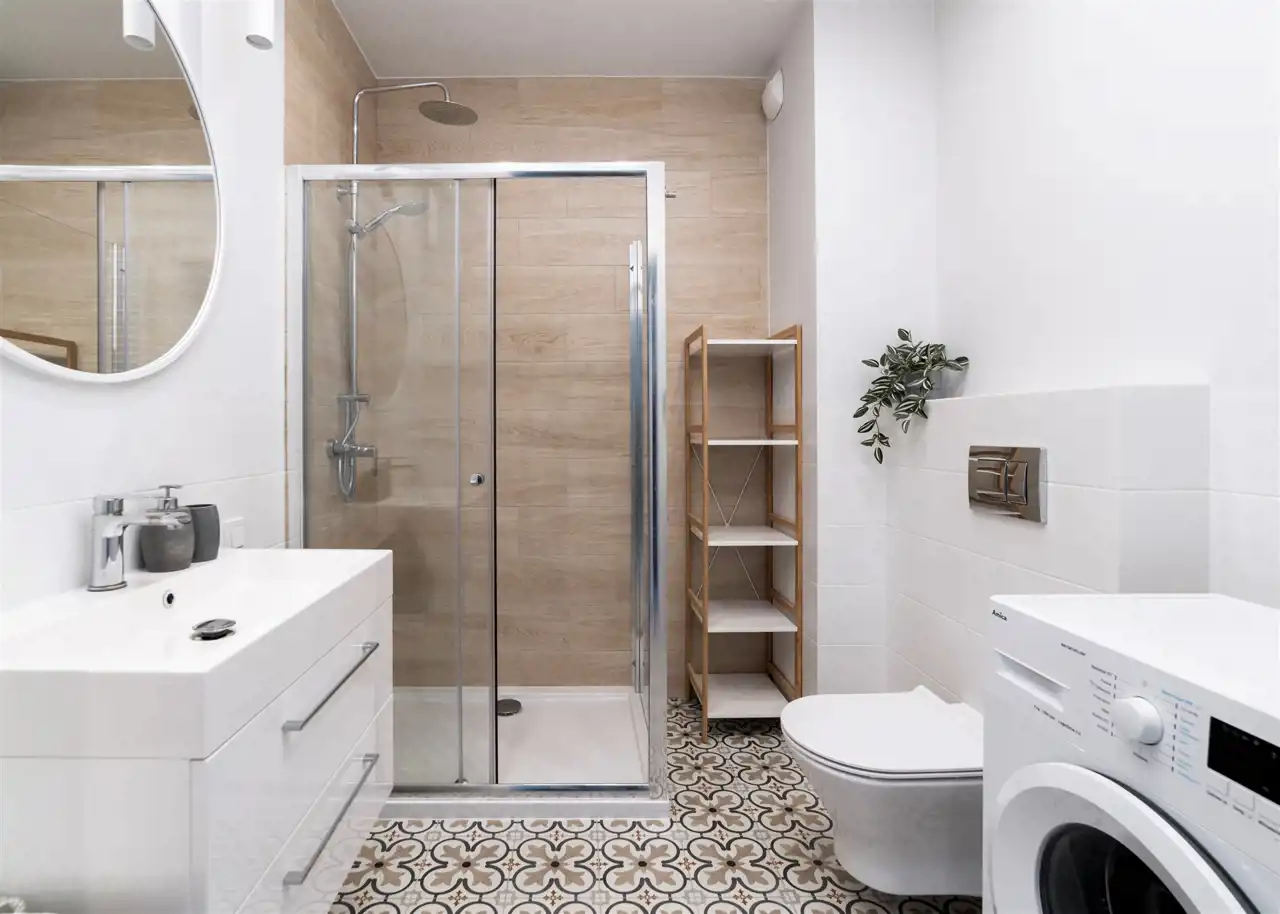 - nowoczesną łazienkę wyposażoną w prysznic oraz pralkę;