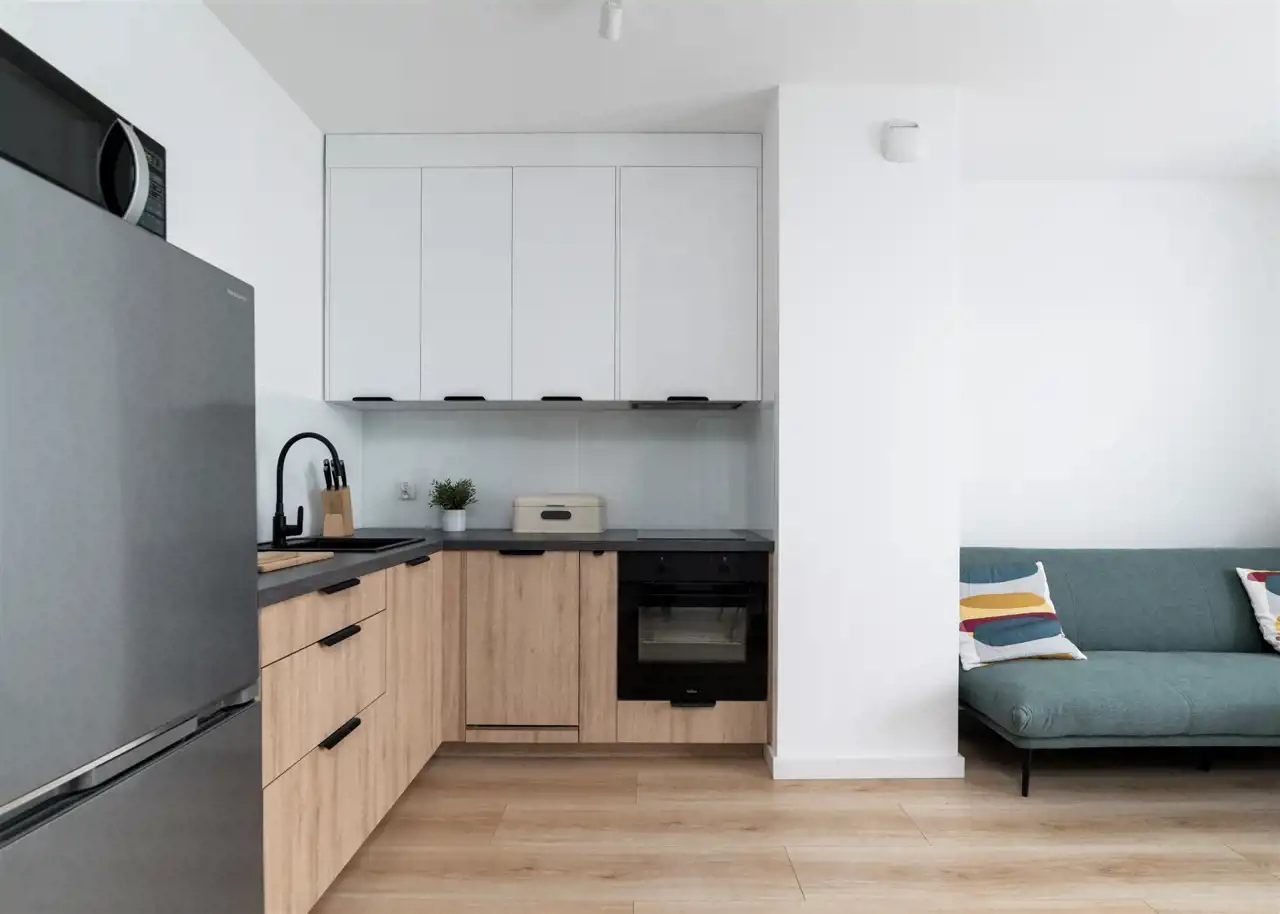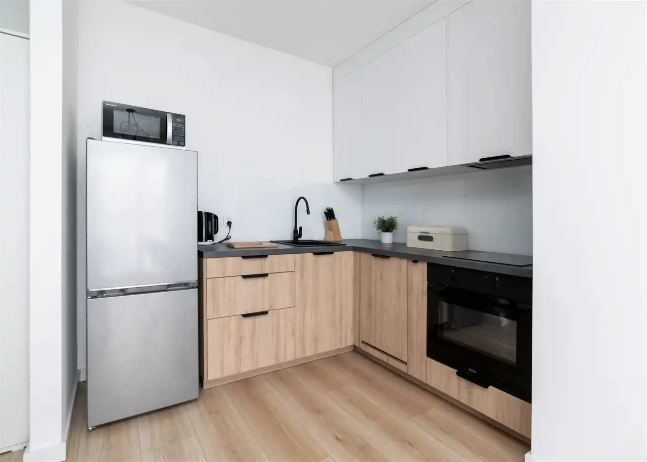 - otwartą, nowoczesną kuchnię wyposażoną w płytę indukcyjną, okap, piekarnik, lodówkę z zamrażarką oraz zmywarkę i mikrofalę;