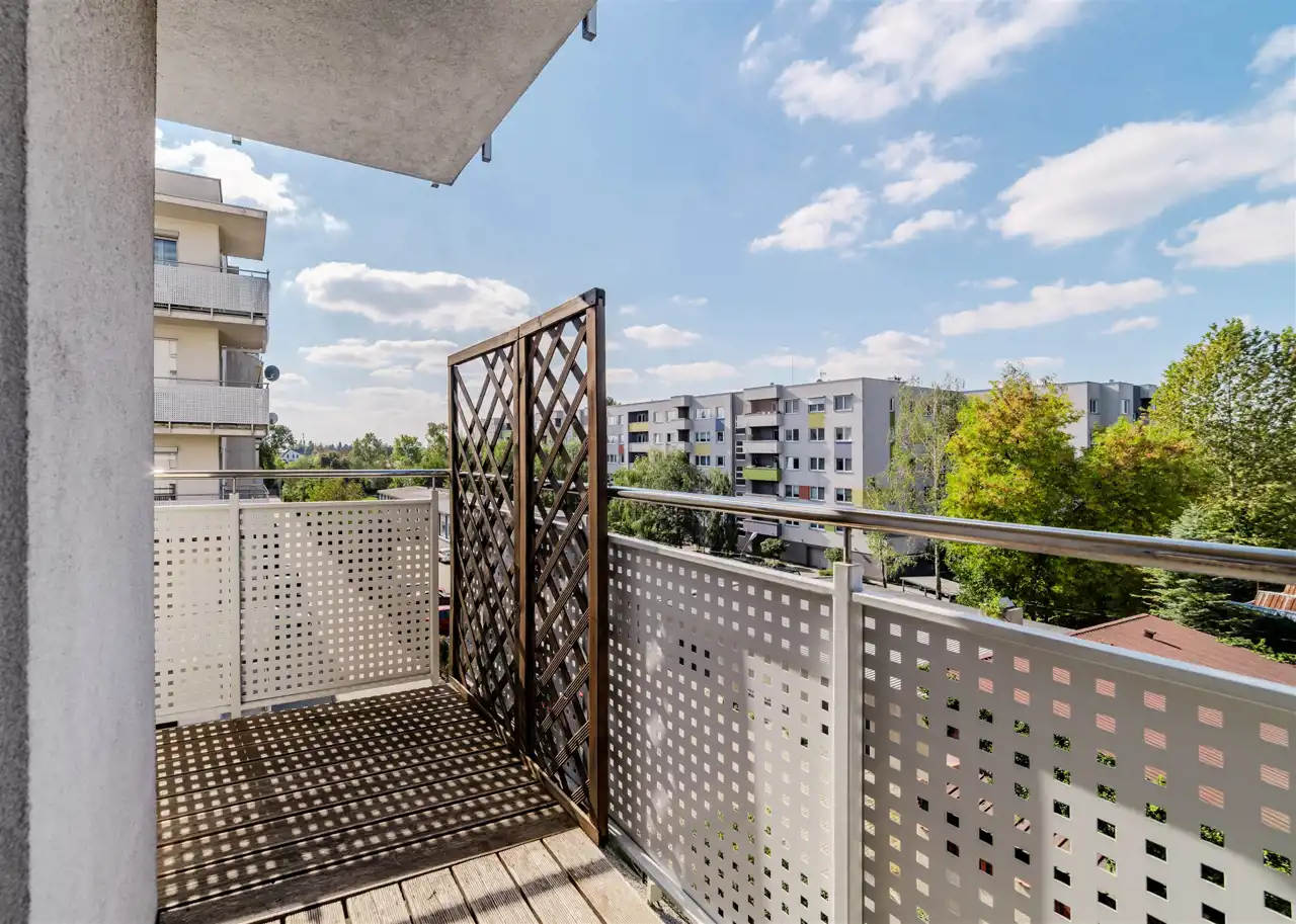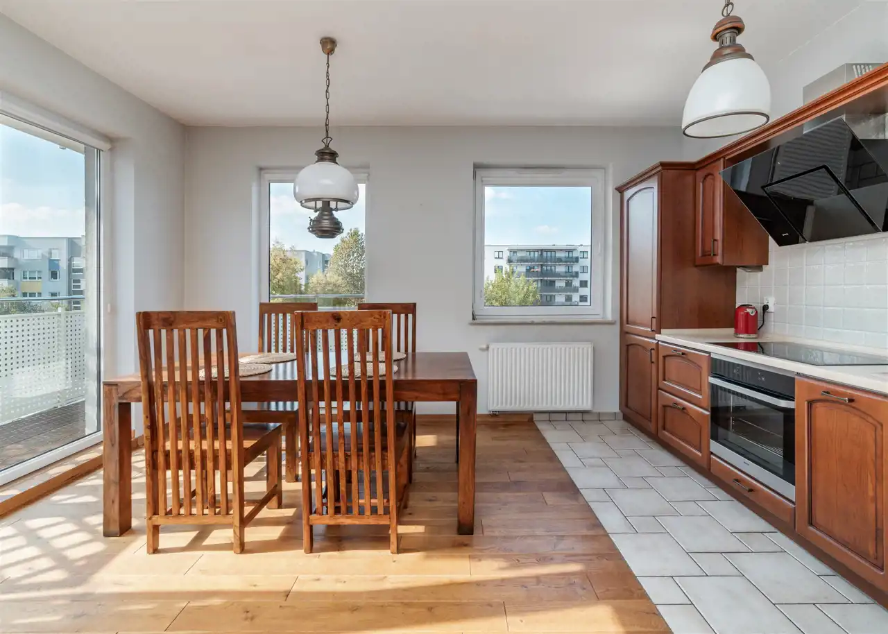 - słoneczny salon z wyjściem na duży, narożny balkon;