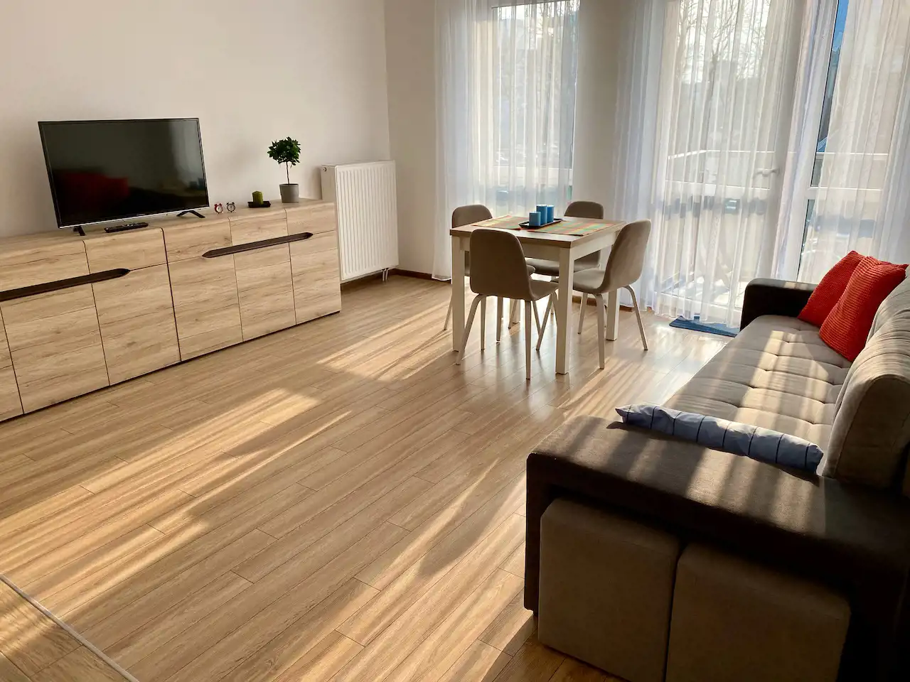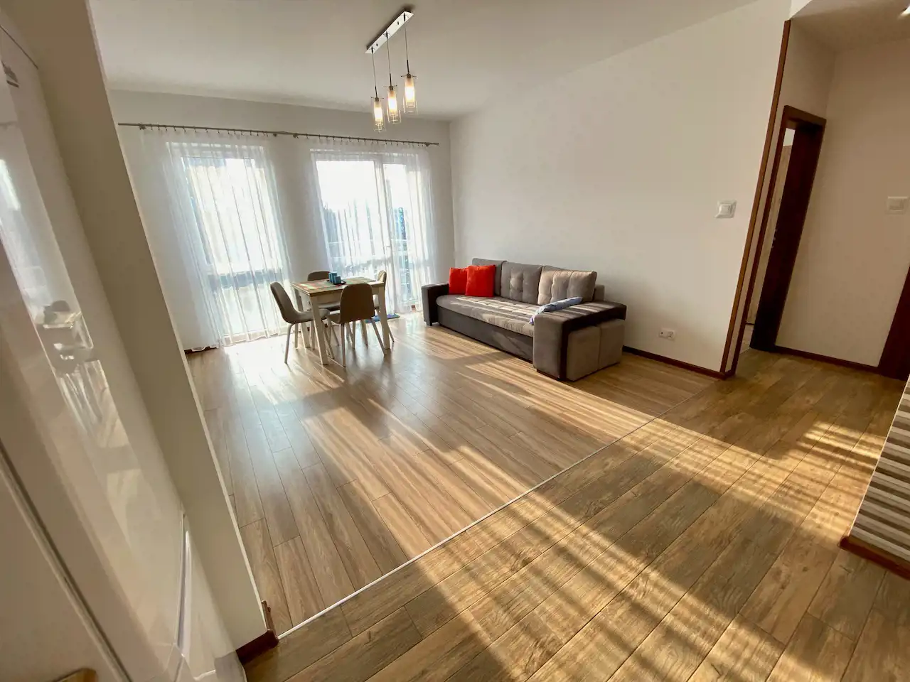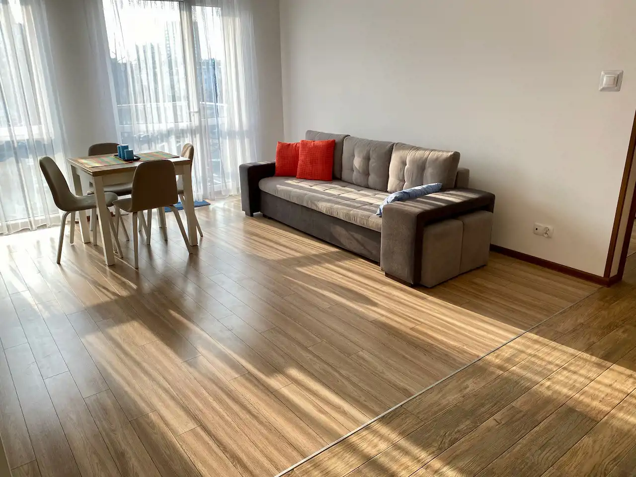 To nowoczesne mieszkanie znajduje się w jednym z najładniejszych nowoczesnych budynków Łodzi. Do garażu wjeżdża się bramą otwieraną pilotem, skąd winda zawozi nas na trzecie piętro. Po wejściu do mieszkania jest hol, z którego na wprost wchodzimy do otwartego salonu oraz do sypialni, a z lewej strony do łazienki. Wygodny balkon. W łazience wanna.