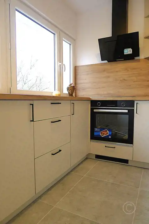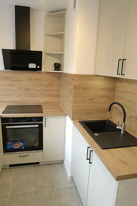 • Oddzielna kuchnia - w pełni urządzona, wyposażona w nowy sprzęt AGD (m.in. płyta, piekarnik, zlewozmywak, brak lodówki).