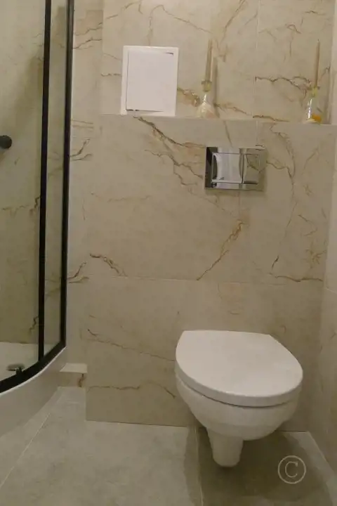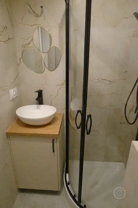 • Łazienka z WC - nowa armatura, kabina prysznicowa, umywalka, toaleta.