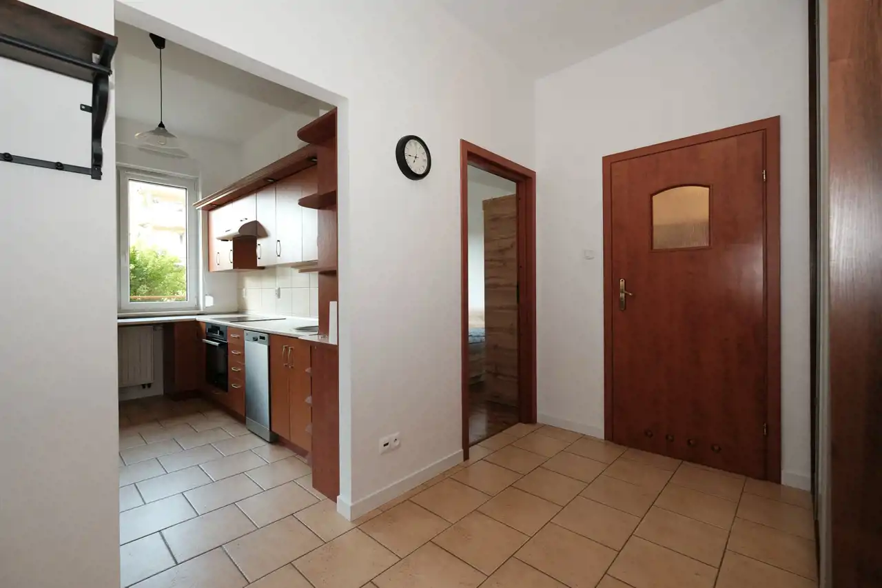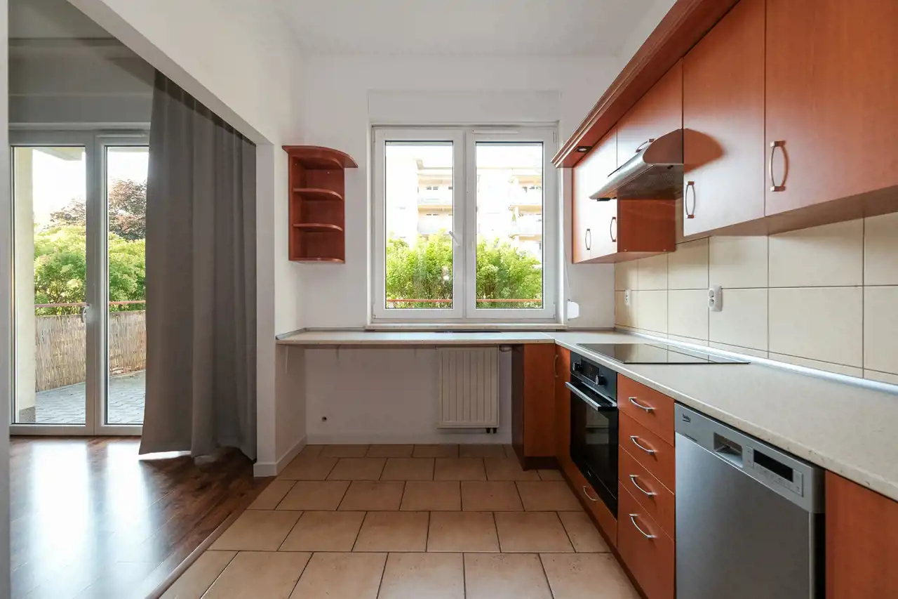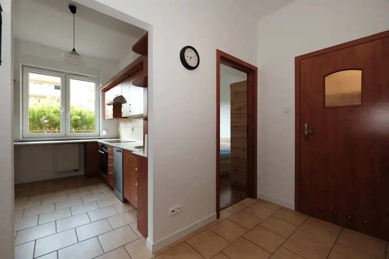 Mieszkanie w pełni umeblowane i wyposażone. W części wypoczynkowo-kuchennej zabudowa kuchenna (na wyposażeniu min. piekarnik, płyta indukcyjna, lodówka z zamrażarką, zmywarka) kanapa, szafka RTV oraz wyjście na własny ogródek.