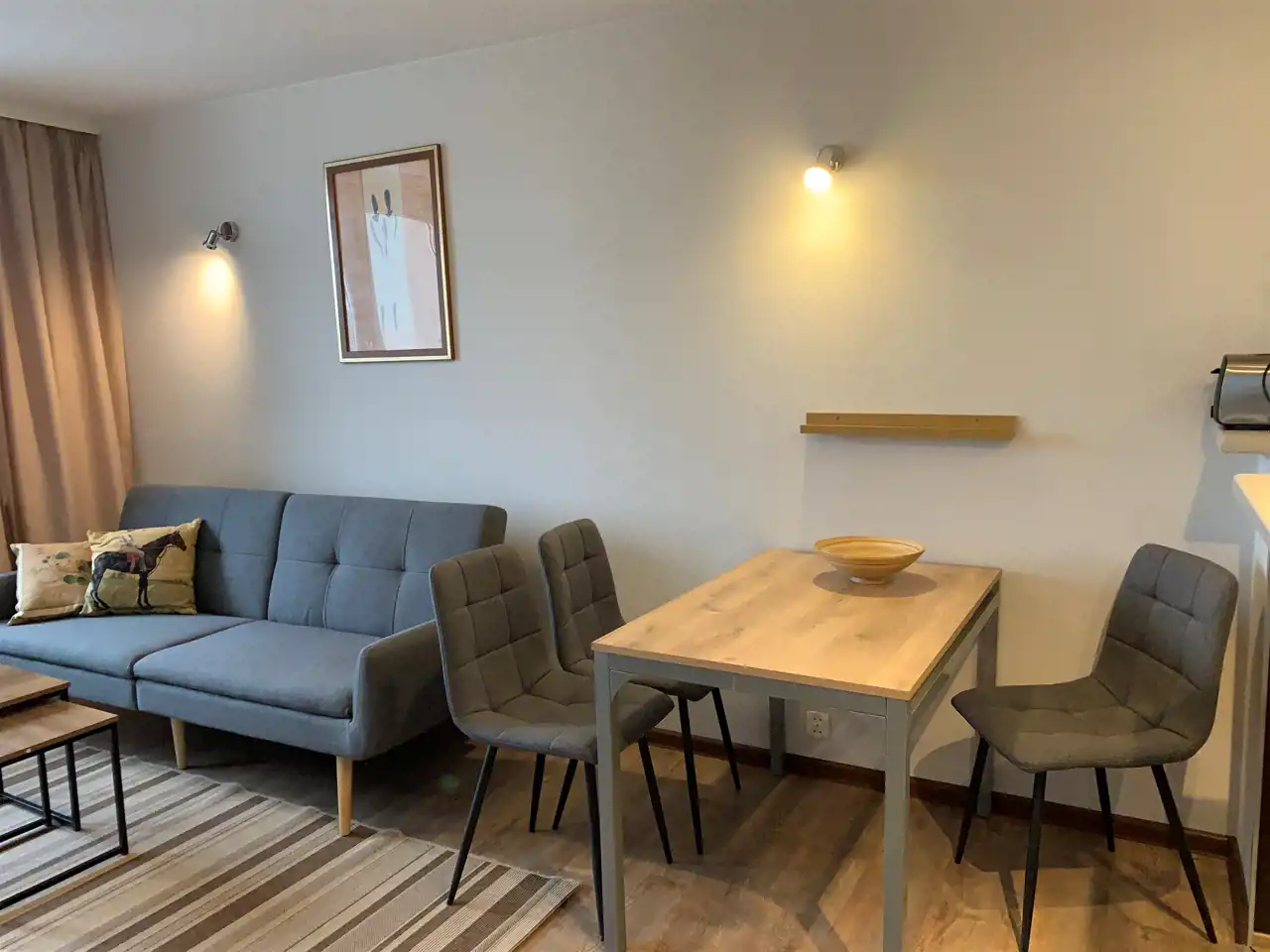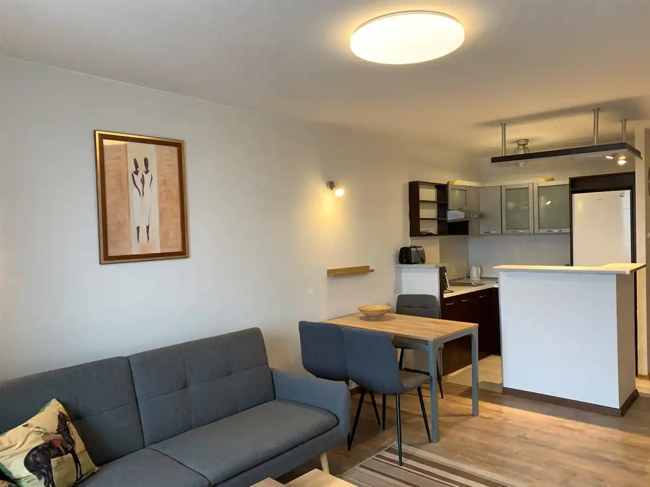 * Salon połączony z aneksem kuchennym; ok. 22mkw. podłoga: panele, kuchnia w zabudowie, regał, wypoczynek, ława, stół, 4 x krzesło, lampa, obrazki, zasłony, dywan,
