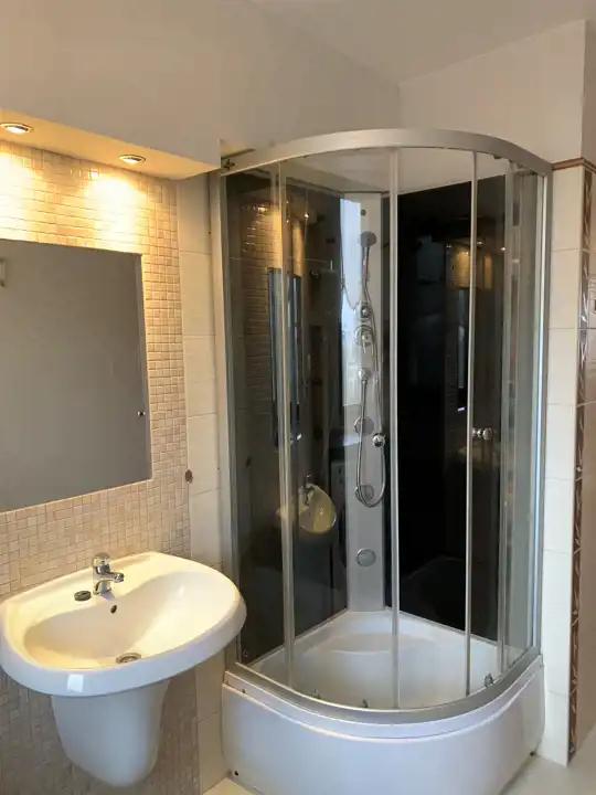 * Łazienka z OKNEM: glazura, terakota; prysznic z hydromasażem, pralka, umywalka, lustro