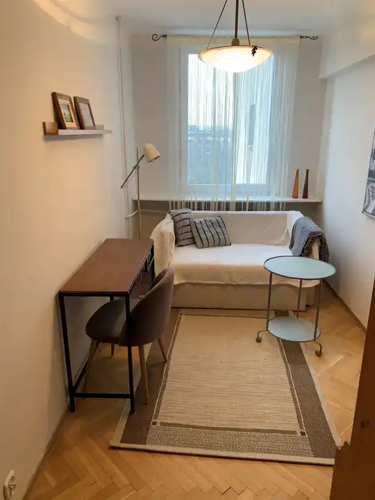 * Pokój o pow. 9 mkw.; parkiet, kanapa, biurko, fotel, komoda, firanki,