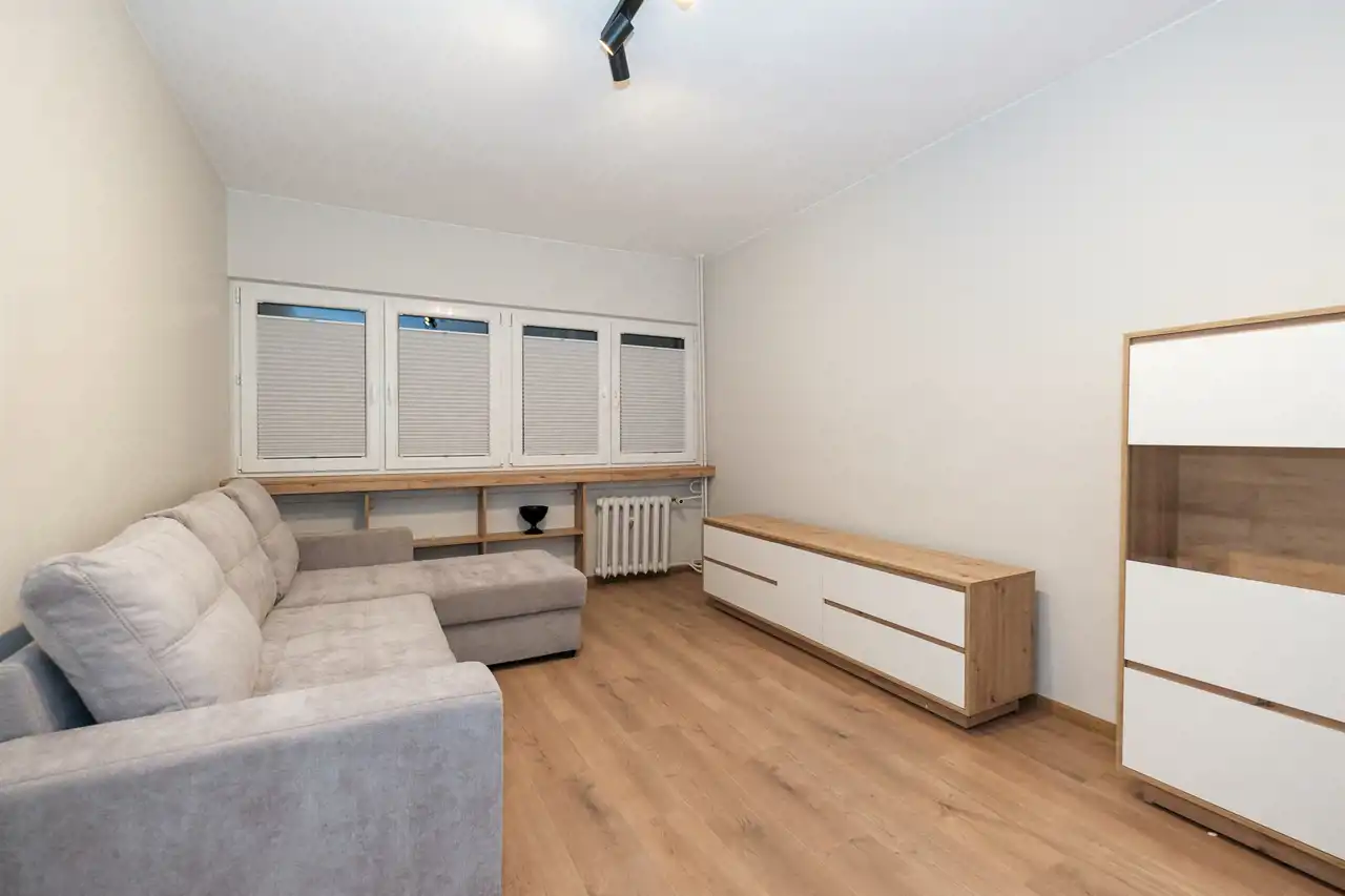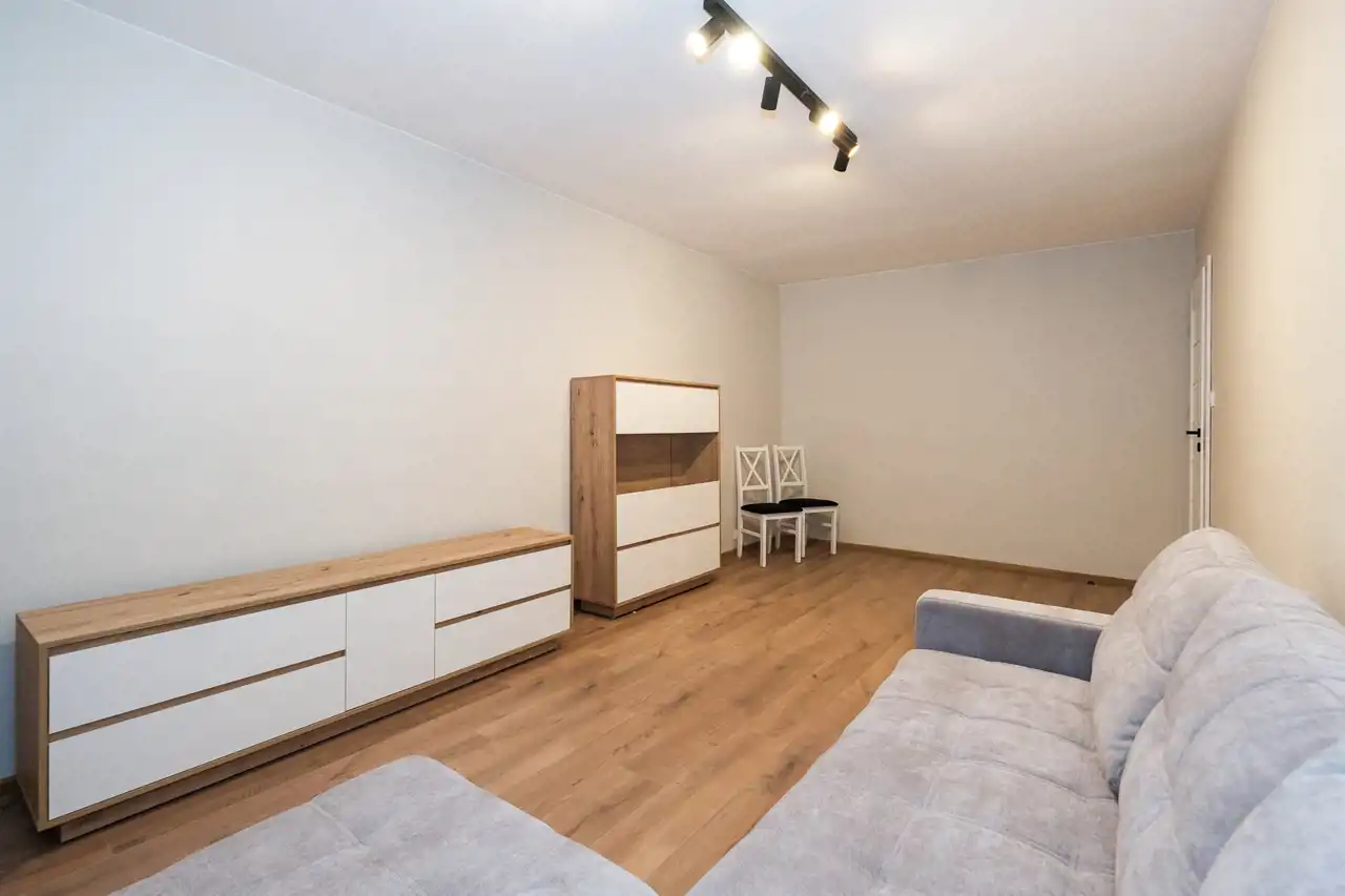 Mieszkanie częściowo umeblowane i wyposażone. W części wypoczynkowej (duży pokój) nowa, rozkładana kanapa naroża, stół z krzesłami, komody. W kuchni meble plus lodówka, zmywarka, kuchenka gazowa z piekarnikiem.