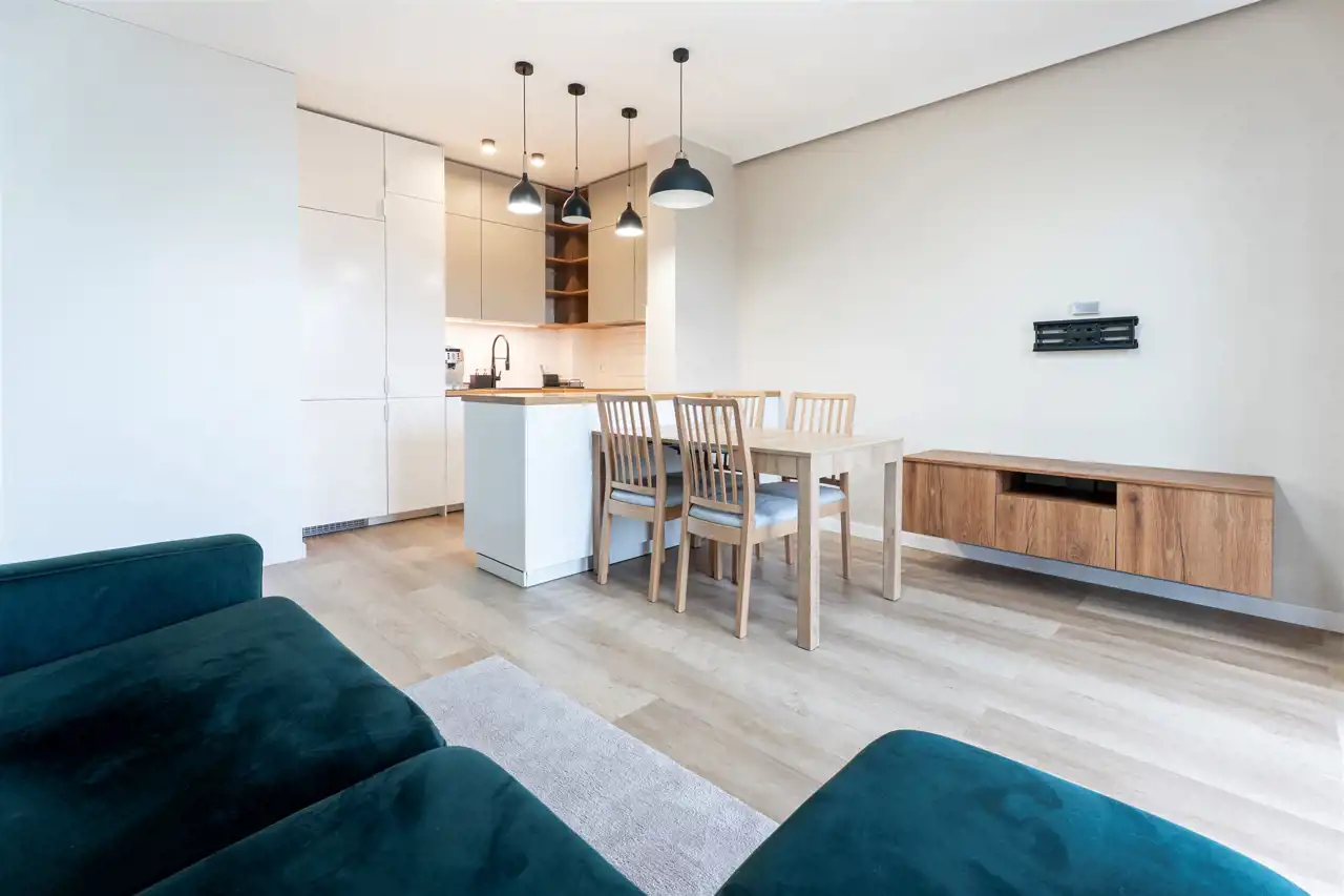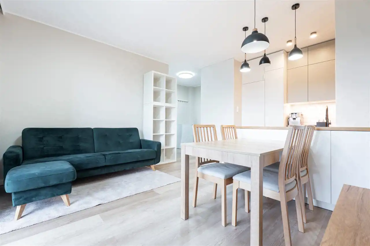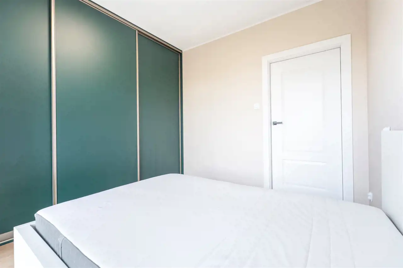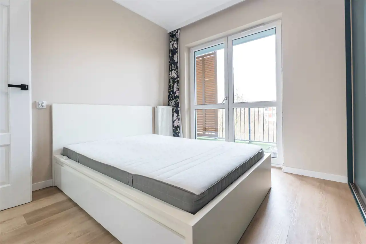 W pełni wyposażone. W salonie kanapa, stół z krzesłami, komoda, regał, szafka RTV. Przy salonie aneks kuchenny, wyposażony w niezbędne sprzęty tj. piekarnik, lodówko-zamrażarkę, zmywarkę, płytę indukcyjna i okap oraz w funkcjonalne meble kuchenne. Sypialnia posiada łóżko 160/200 z materacem oraz dużą przestronną szafę w zabudowie. W łazience prysznic, umywalka z lustrem oraz pralka. W przedpokoju dodatkowa szafa. Mieszkanie wykończone w nowoczesnym stylu, w utrzymaniu jasnej kolorystyki.