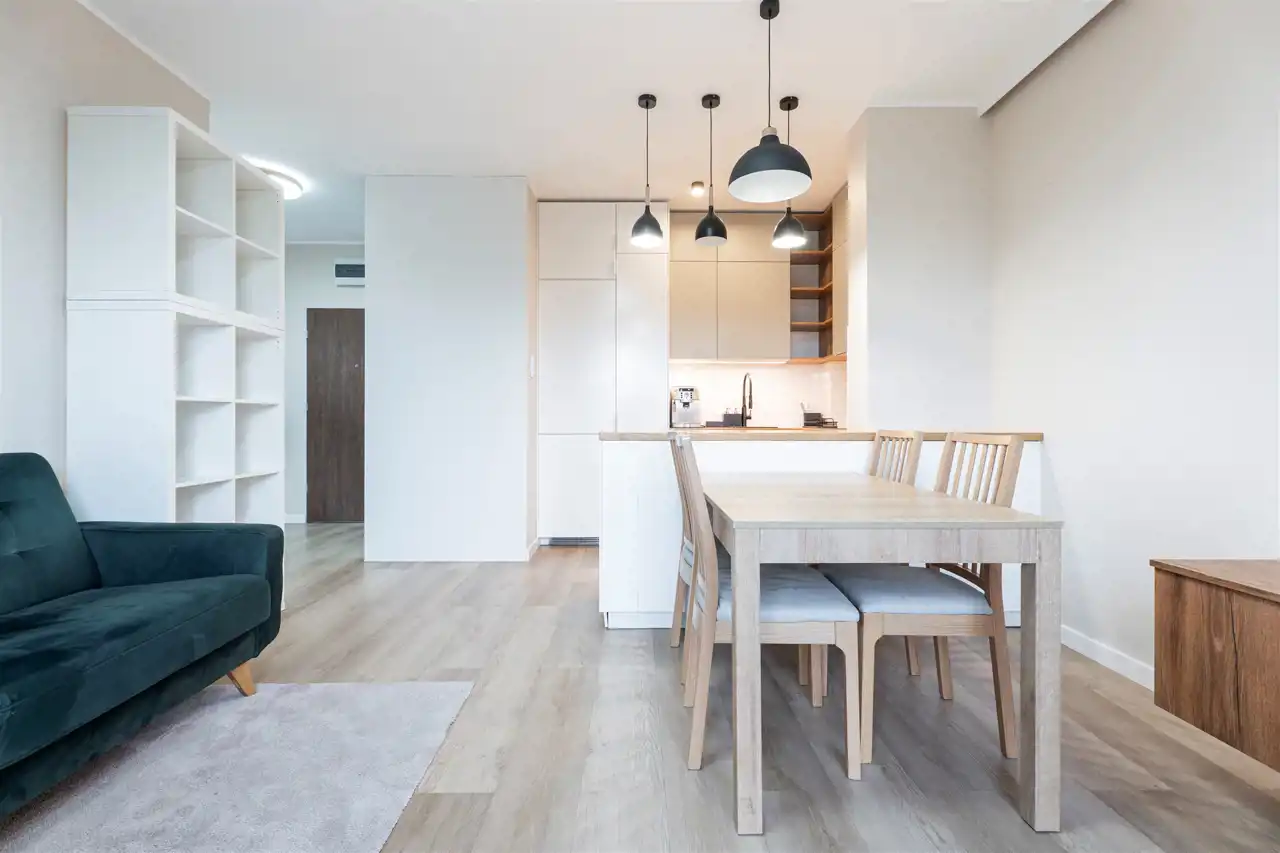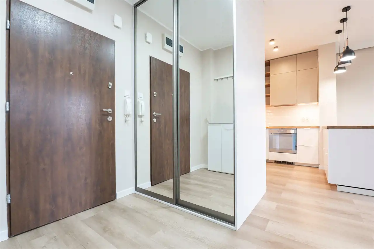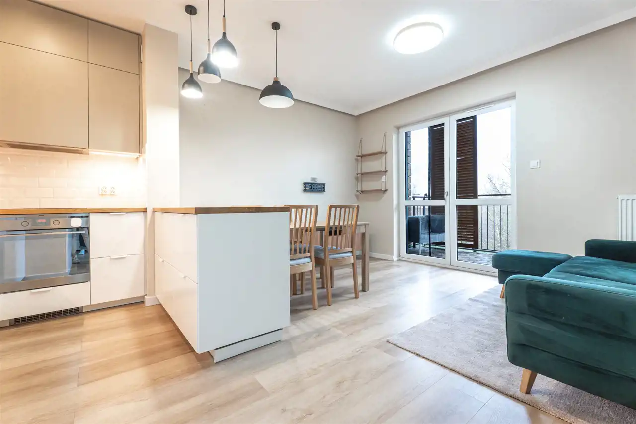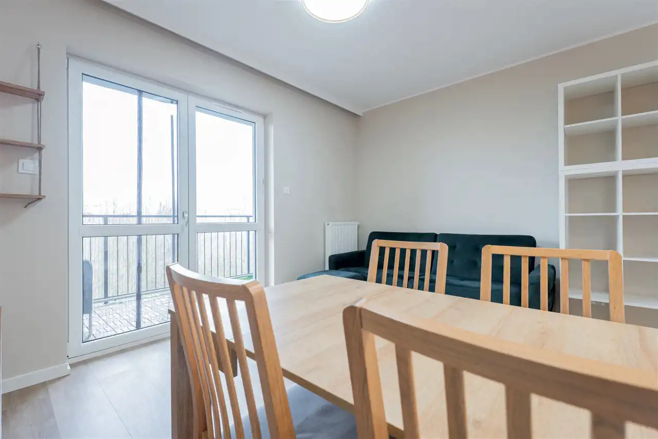 W pełni wyposażone. W salonie kanapa, stół z krzesłami, komoda, regał, szafka RTV. Przy salonie aneks kuchenny, wyposażony w niezbędne sprzęty tj. piekarnik, lodówko-zamrażarkę, zmywarkę, płytę indukcyjna i okap oraz w funkcjonalne meble kuchenne. Sypialnia posiada łóżko 160/200 z materacem oraz dużą przestronną szafę w zabudowie. W łazience prysznic, umywalka z lustrem oraz pralka. W przedpokoju dodatkowa szafa. Mieszkanie wykończone w nowoczesnym stylu, w utrzymaniu jasnej kolorystyki.