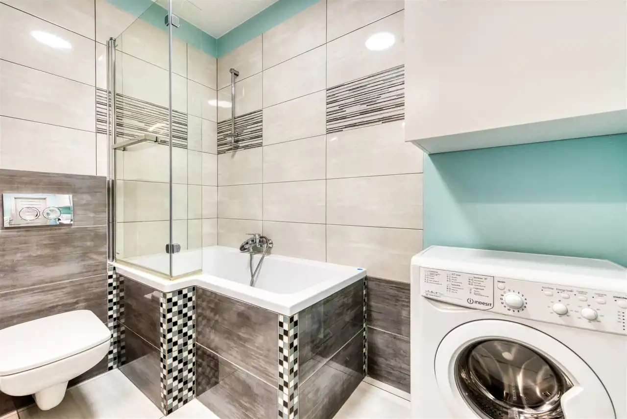 - łazienkę z WC wyposażoną w wannę z funkcją natrysku oraz pralkę;