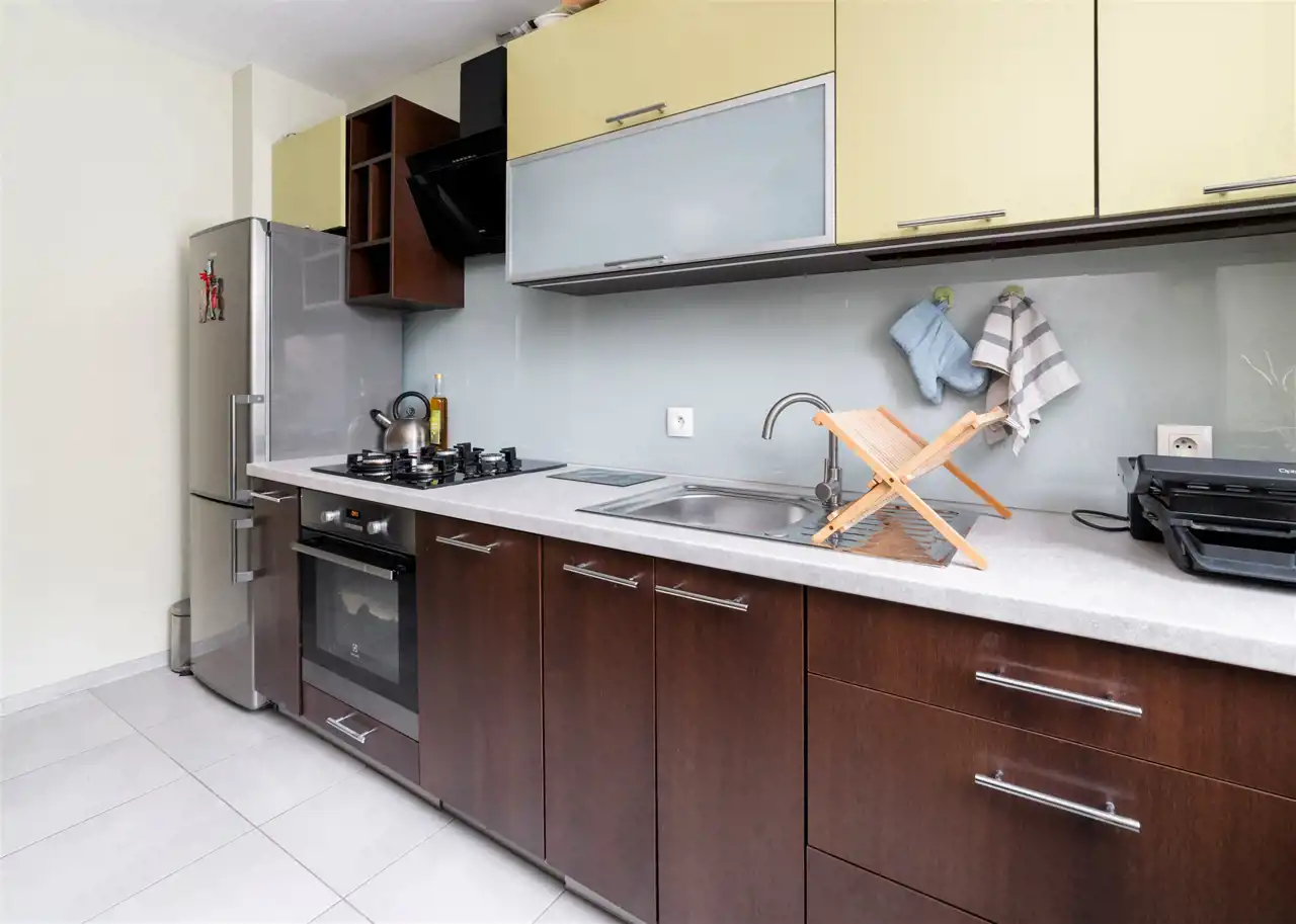 - otwartą kuchnię wyposażoną w płytę gazową, piekarnik, zmywarkę i lodówkę z zamrażarką;