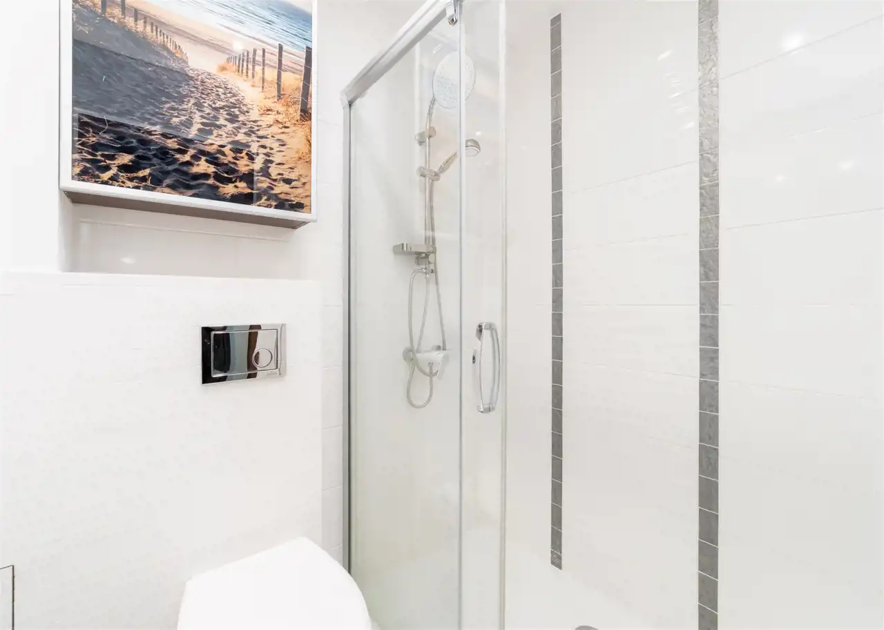 - nowoczesną łazienkę wyposażoną w natrysk oraz pralkę;