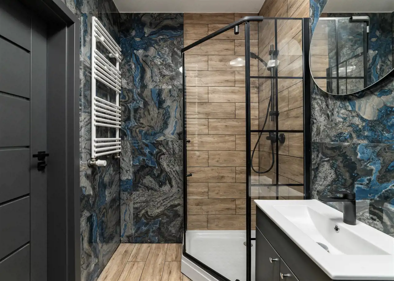 - nowoczesną łazienkę z WC wyposażoną w prysznic oraz pralkę;