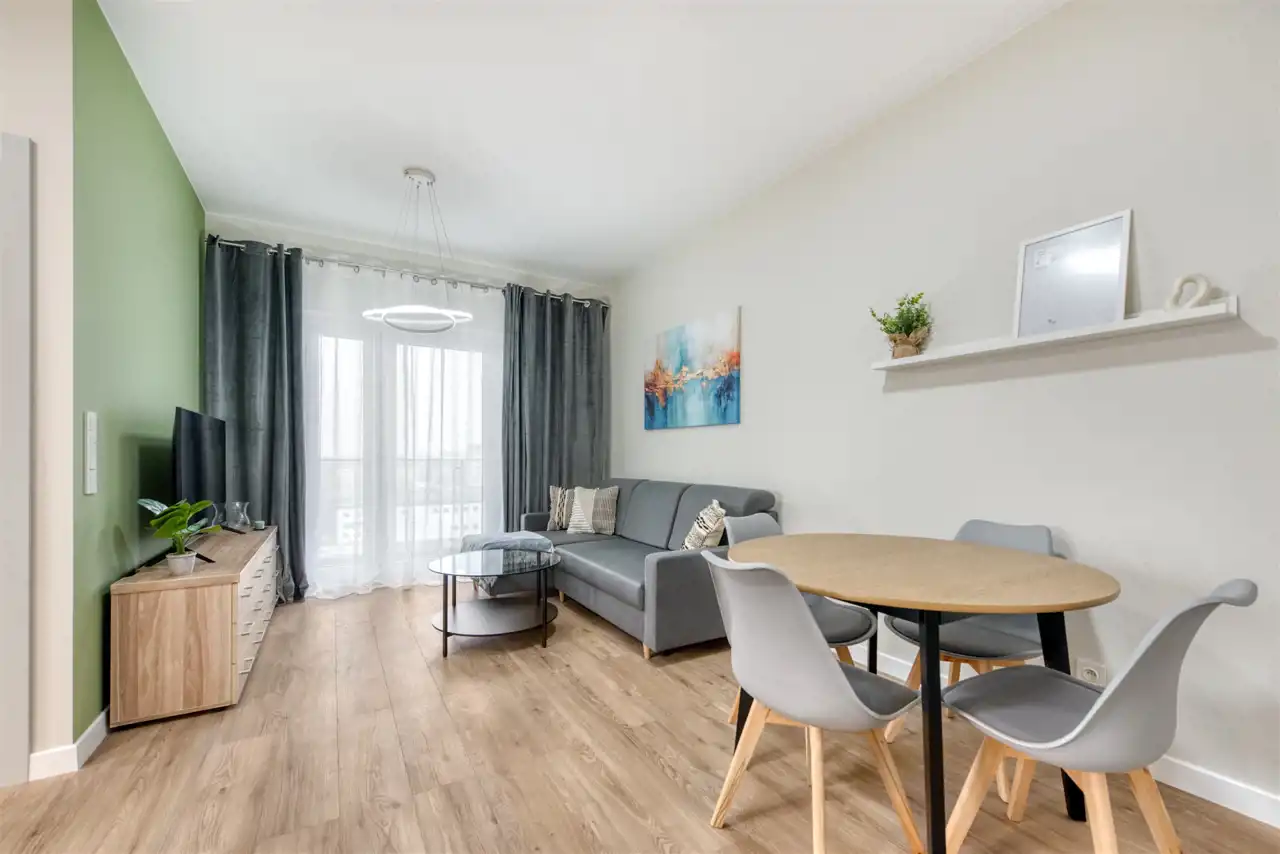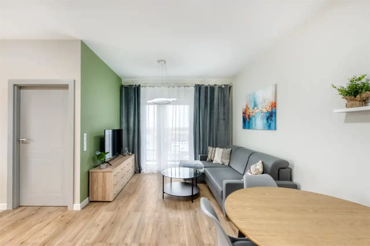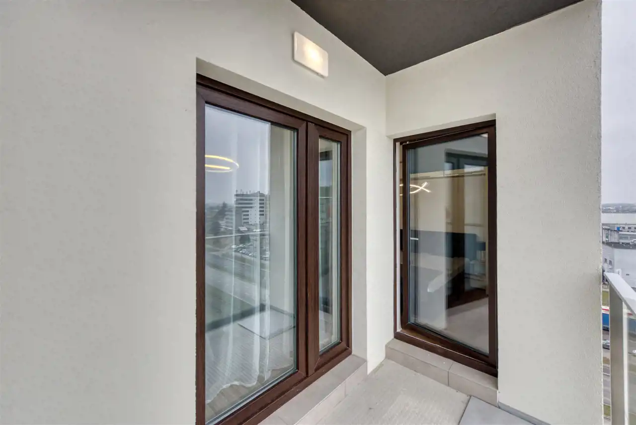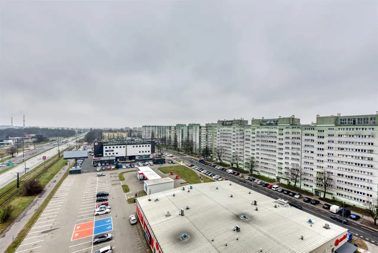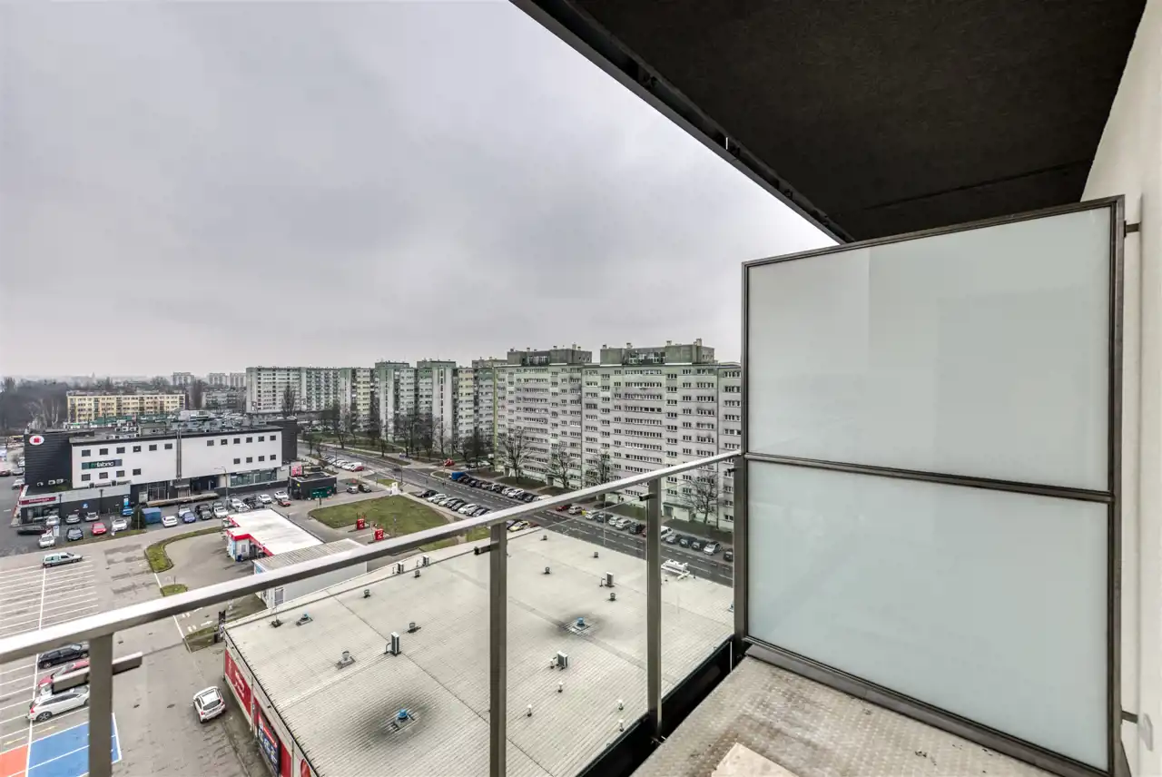 - słoneczny pokój dzienny z wyjściem na balkon, z którego rozpościera się ładny widok na panoramę okolicy;
