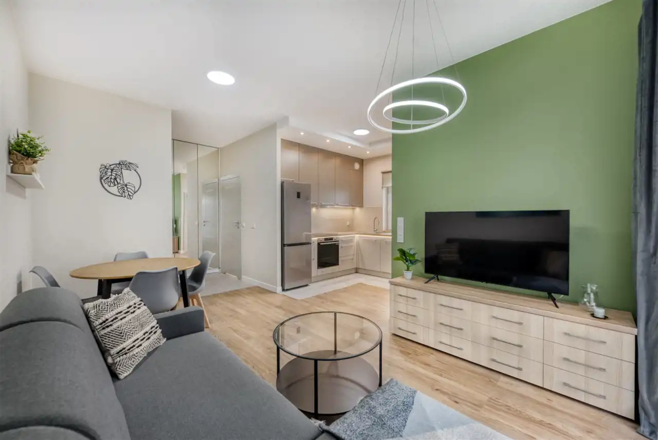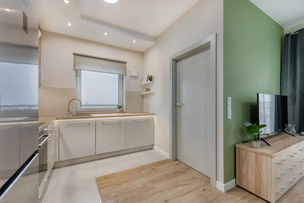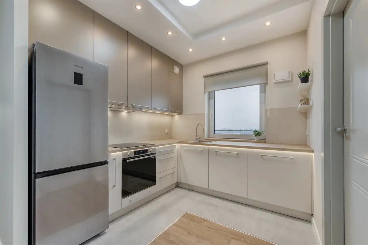 - aneks kuchenny wyposażony w płytę indukcyjną, piekarnik, lodówko-zamrażarkę i zmywarkę;