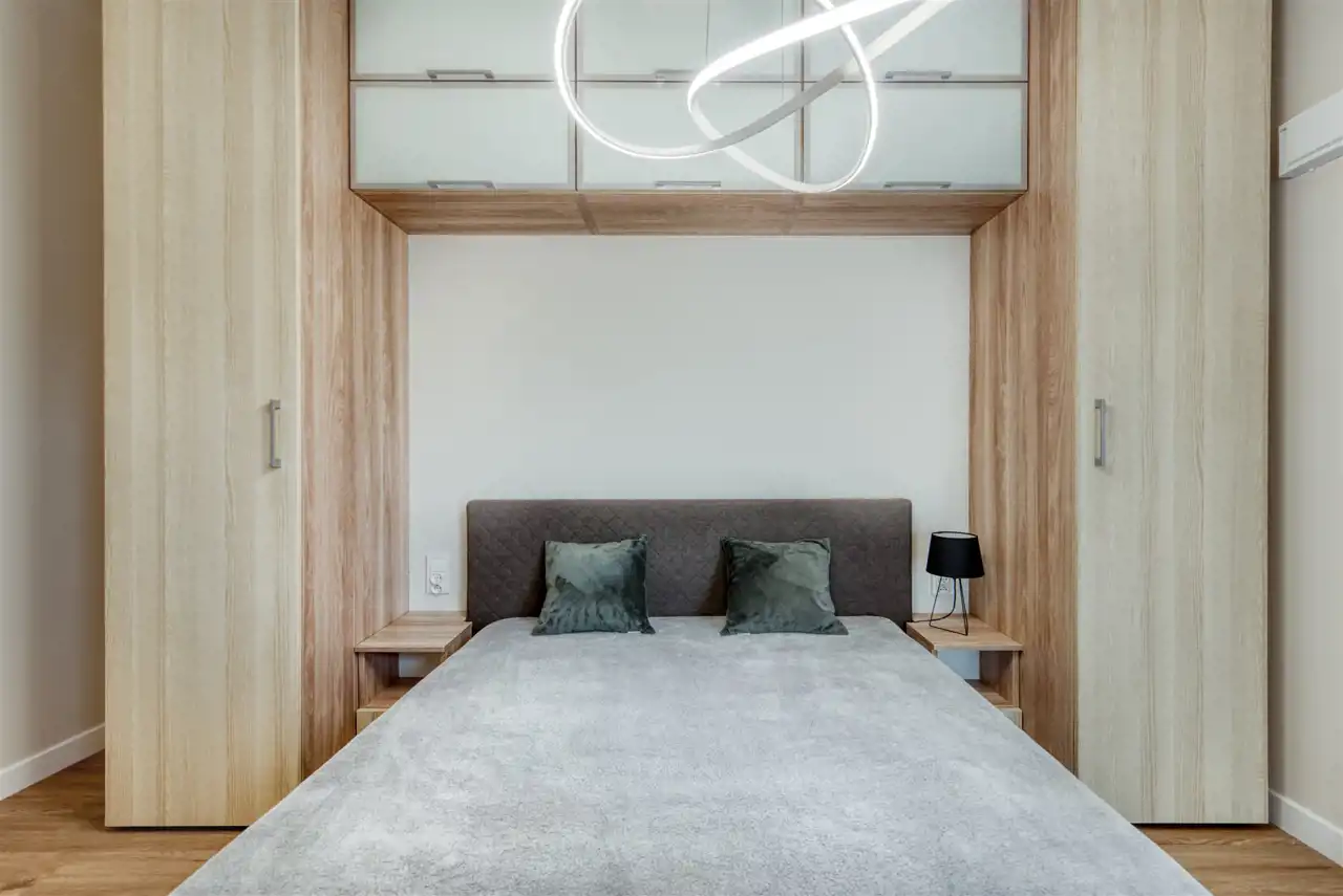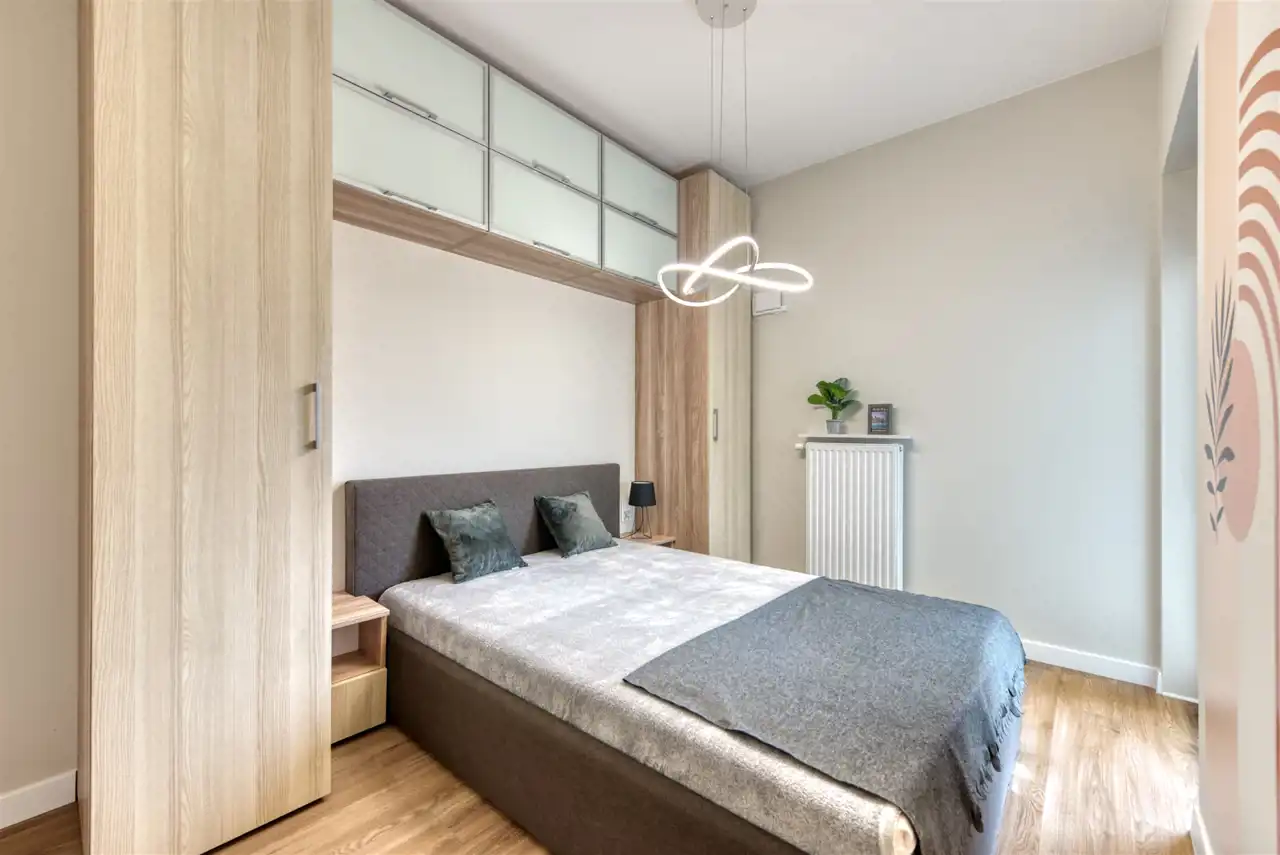 - sypialnię z łóżkiem i zabudowanymi szafami oraz drugim wyjściem na balkon;
