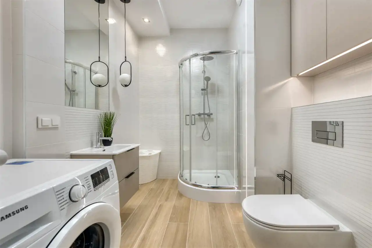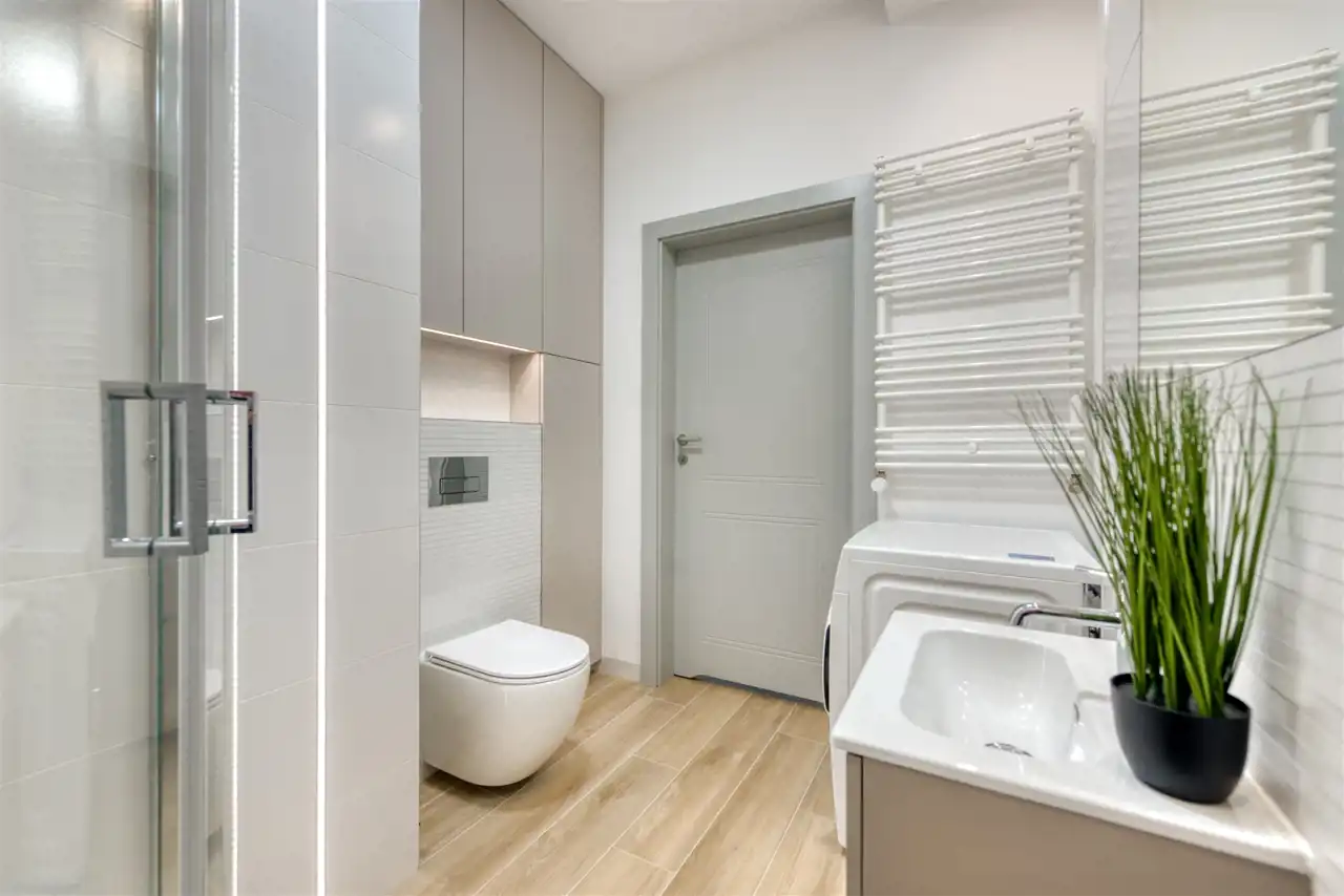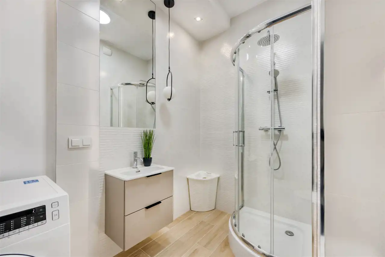 - nowoczesną łazienkę z WC wyposażoną w prysznic oraz pralkę;