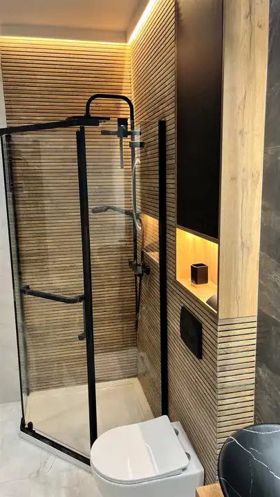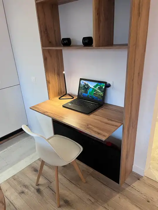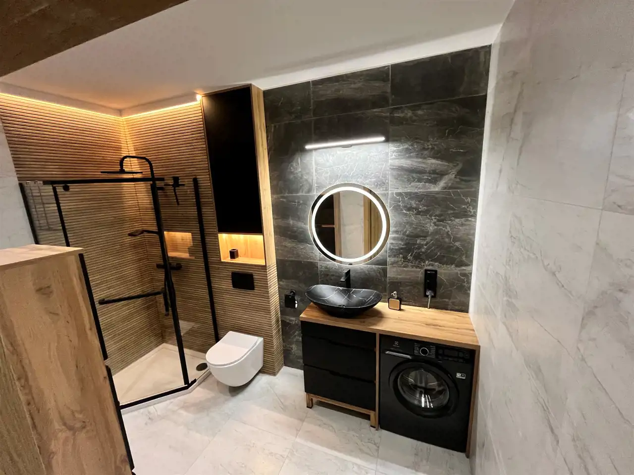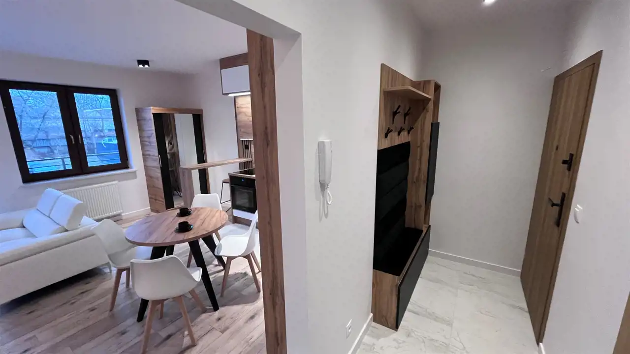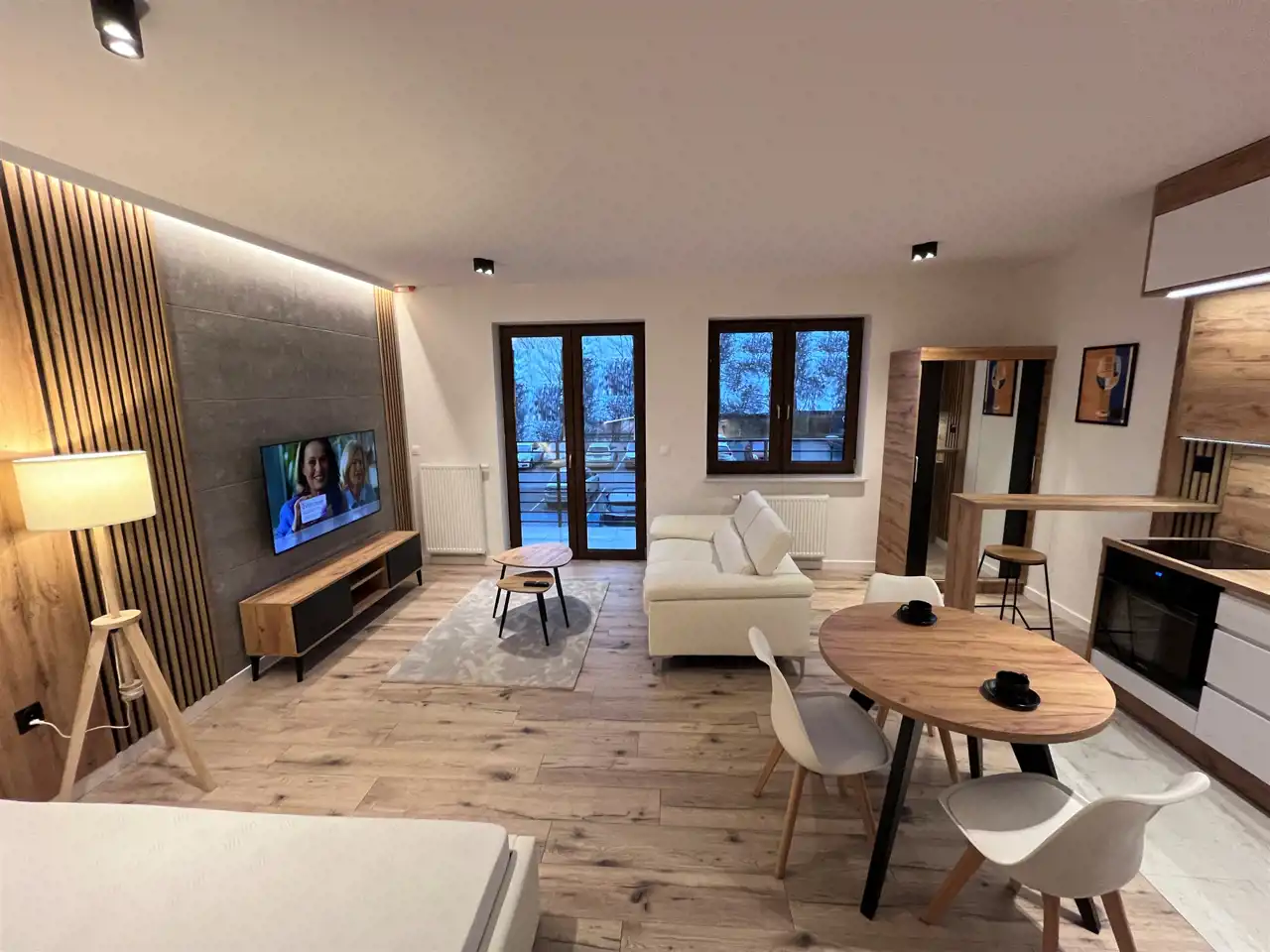 W salonie znajdziemy wygodną skórzaną kanapę, łóżko kontynentalne, szafkę RTV, TV Samsung Qled 55 cali, stolik kawowy, rozkładany stół z krzesłami oraz biurko, ponadto szafa. Aneks kuchenny wyposażony w lodówko-zamrażarkę, piekarnik, płytę indukcyjną. Toaleta z prysznicem typu walk-in, umywalką, pralką oraz WC.