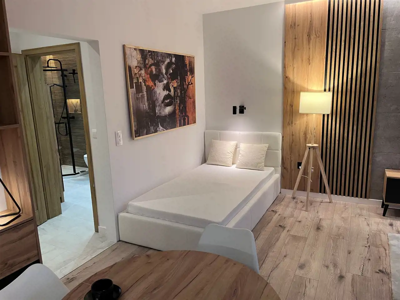 Apartament składa się z salonu z aneksem kuchennym, łazienki razem z WC oraz przedpokoju. Całość wykończona bardzo gustownie przy użyciu materiałów wysokiej jakości. Do do dyspozycji najemcy ogólnodostępny parking oraz komórka lokatorska (w cenie).