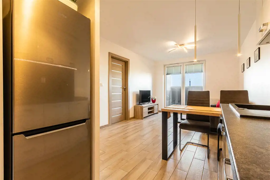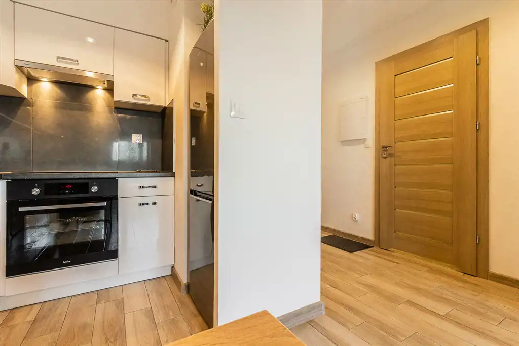 - aneks kuchenny wyposażony w w płytę indukcyjną, okap, piekarnik, lodówkę z zamrażarką, zmywarkę oraz drobne wyposażenie;