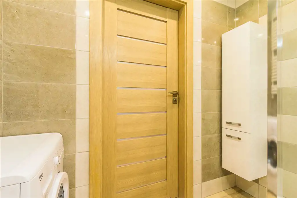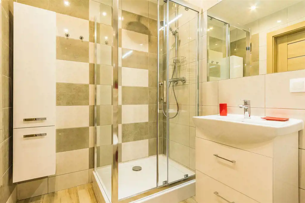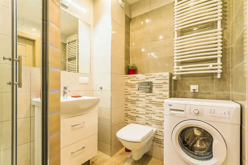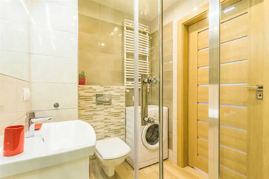 - nowoczesną łazienkę z WC wyposażoną w kabinę prysznicową oraz pralkę;